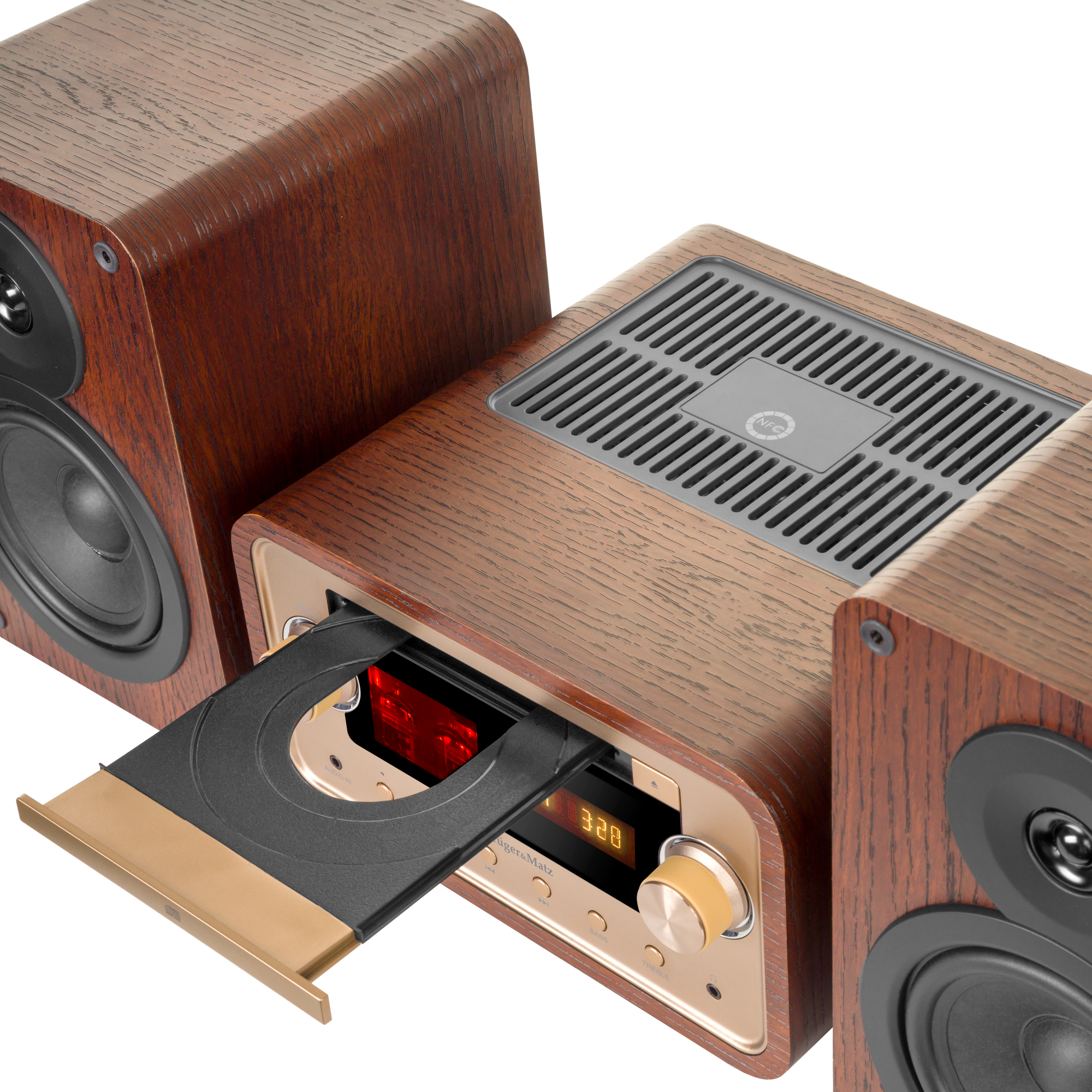 Domowy sprzęt audio musi zachwycać nie tylko wysoką jakością dźwięku, ale także wyszukanym wyglądem. Elegancja drewnianych kolumn i jednostki centralnej została doskonale podkreślona przez bursztynową poświatę lamp. Takie połączenie to idealne uzupełnienie Twojego salonu.