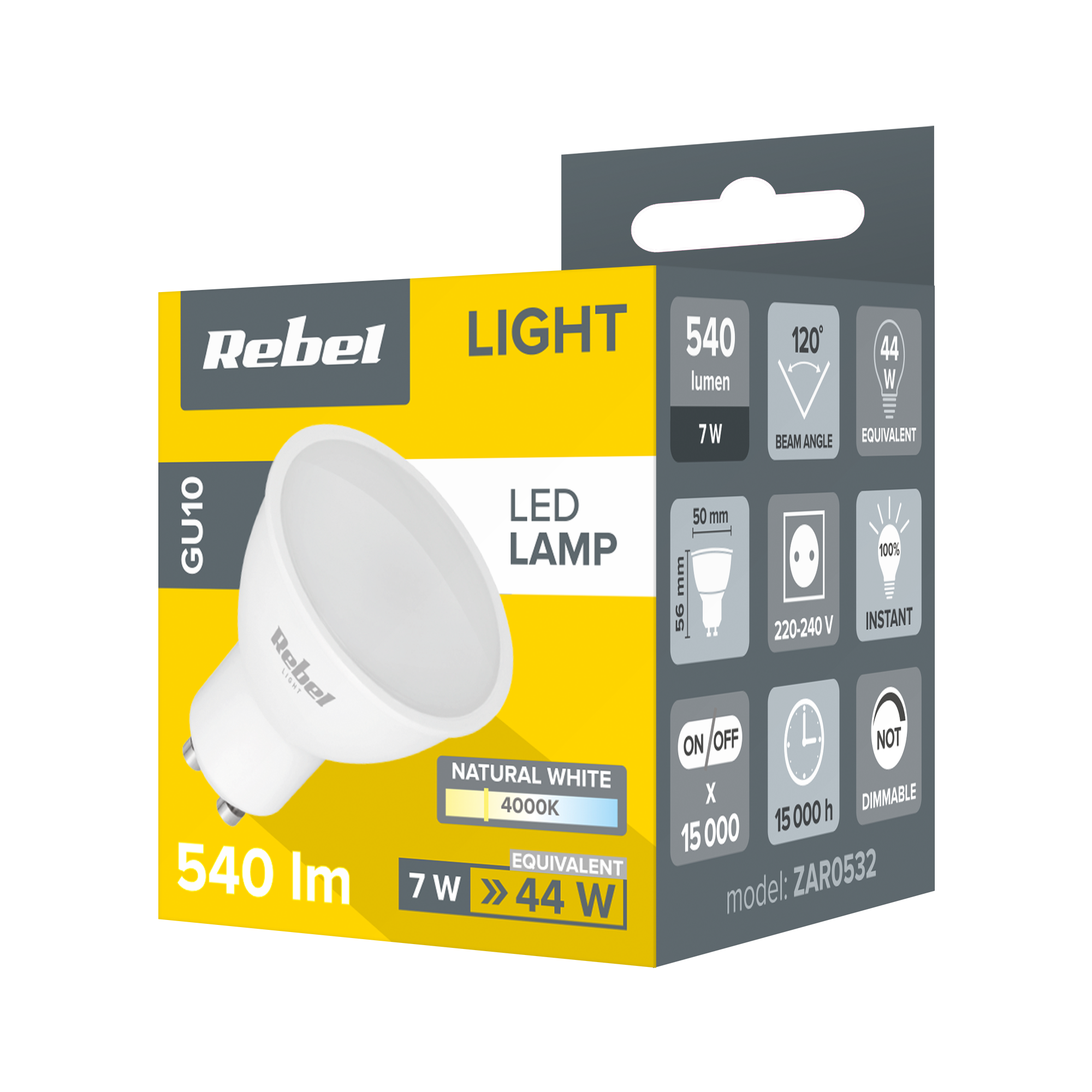 Żarówka LED o mocy 7 W i 540 lm z serii Rebel to gwarancja wysokiej wydajności i niskiego zużycia energii. Charakteryzuje się długą żywotnością oraz szerokim, 120-stopniowym kątem świecenia w naturalnym kolorze. Lampa LED marki Rebel zalicza się do klasy energetycznej G i jest zgodna z ostatnimi rozporządzeniami Komisji Europejskiej dotyczącymi etykietowania energetycznego źródeł światła oraz wymogów dotyczących ekoprojektu dla źródeł światła.