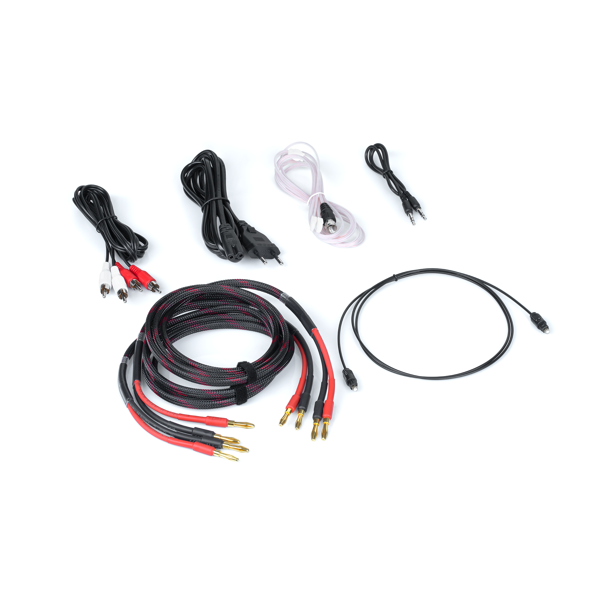 W zestawie: kabel zasilający, kabel optyczny, kabel RCA, kabel głośnikowy, antena radiowa, pilot