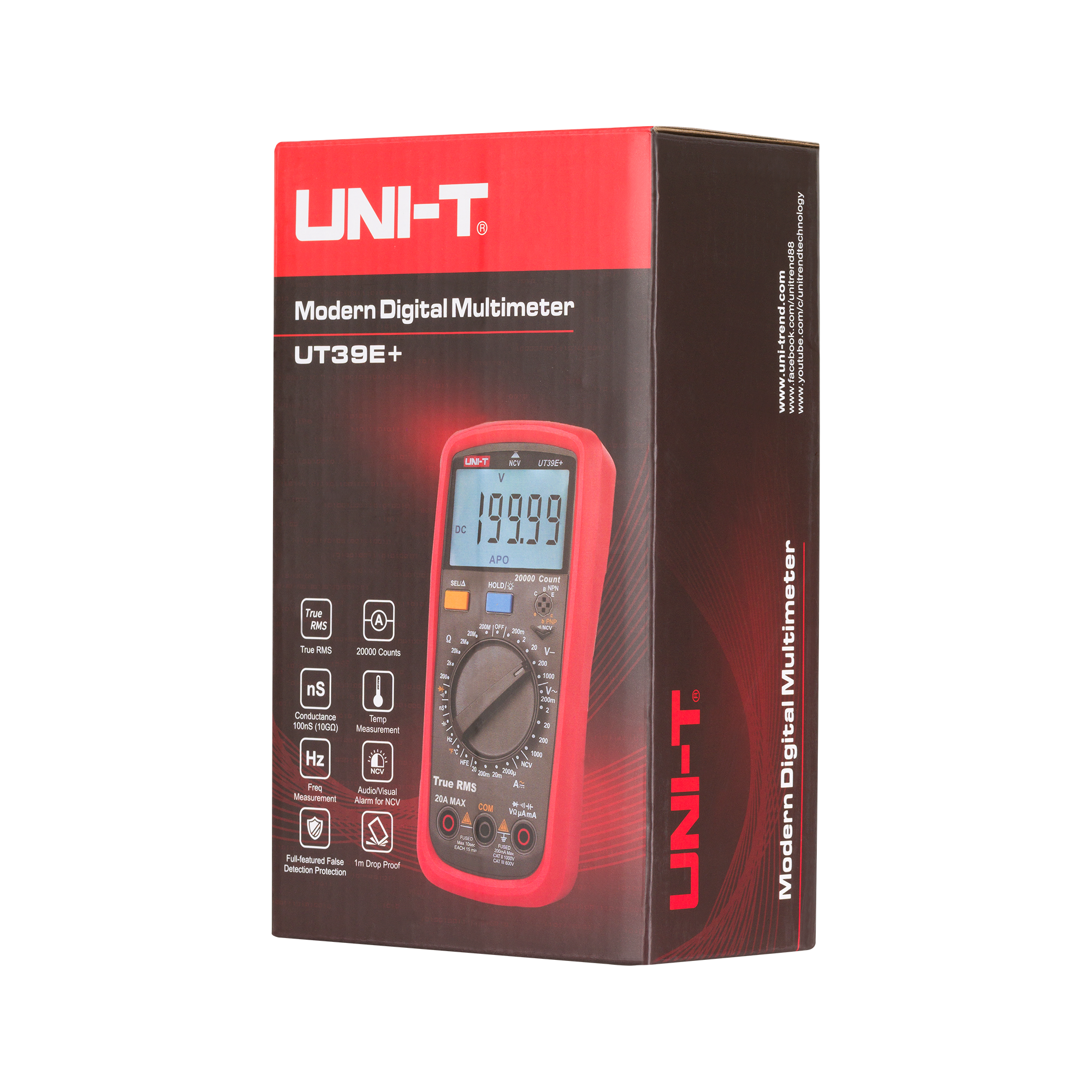 UT39E+ umożliwia precyzyjny pomiar napięcia stałego do 1000 V oraz zmiennego do 1000 V, a także natężenia prądu stałego i zmiennego do 20 A. Dodatkowo miernik oferuje funkcje pomiaru rezystancji do 200 MOhm, pojemności do 2000 µF oraz częstotliwości w zakresie od 10 Hz do 2 MHz. Dzięki możliwości pomiaru temperatury od -40°C do 1000°C, urządzenie jest niezwykle wszechstronne, sprawdzając się w szerokim zakresie zastosowań.