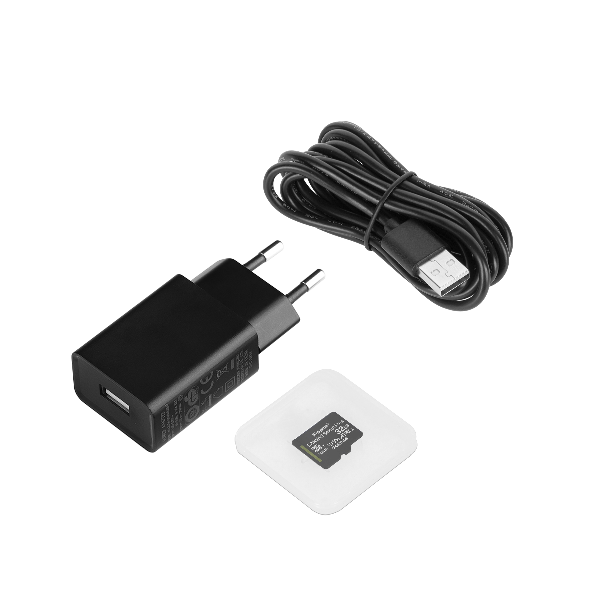 Kamera jest dostarczana z ładowarką USB (5V, 1,5A), przewodem USB typu C oraz kartą micro SD, co umożliwia łatwe przechowywanie i transfer danych. Certyfikaty RoHS i CE zapewniają zgodność z europejskimi normami bezpieczeństwa.