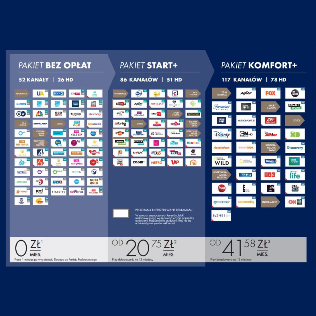 Inne: Obraz w rozdzielczości (HDTV) 720p; 1080i Skalowanie sygnału SDTV (PAL) do rozdzielczości HDTV (720p; 1080i); Kanały FTA; Pakiet Komfort+ z Filmbox opłacony na 6 miesięcy