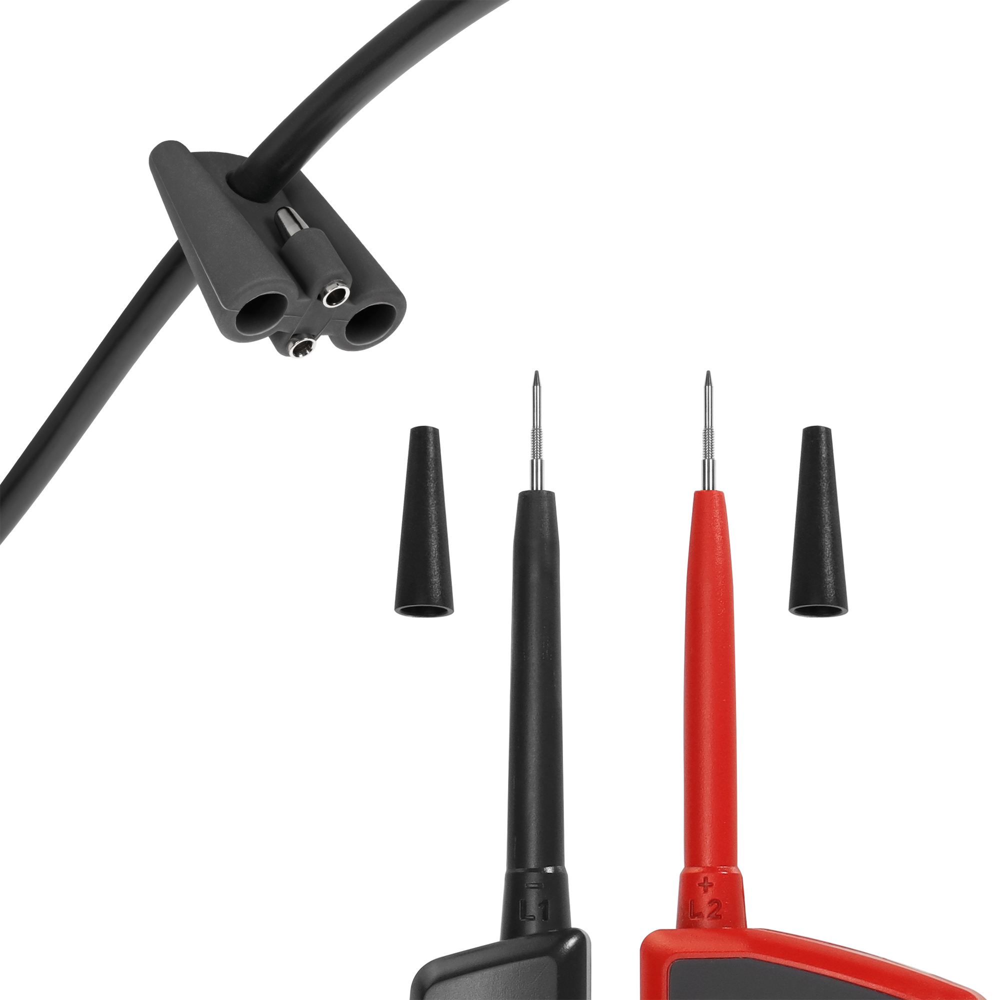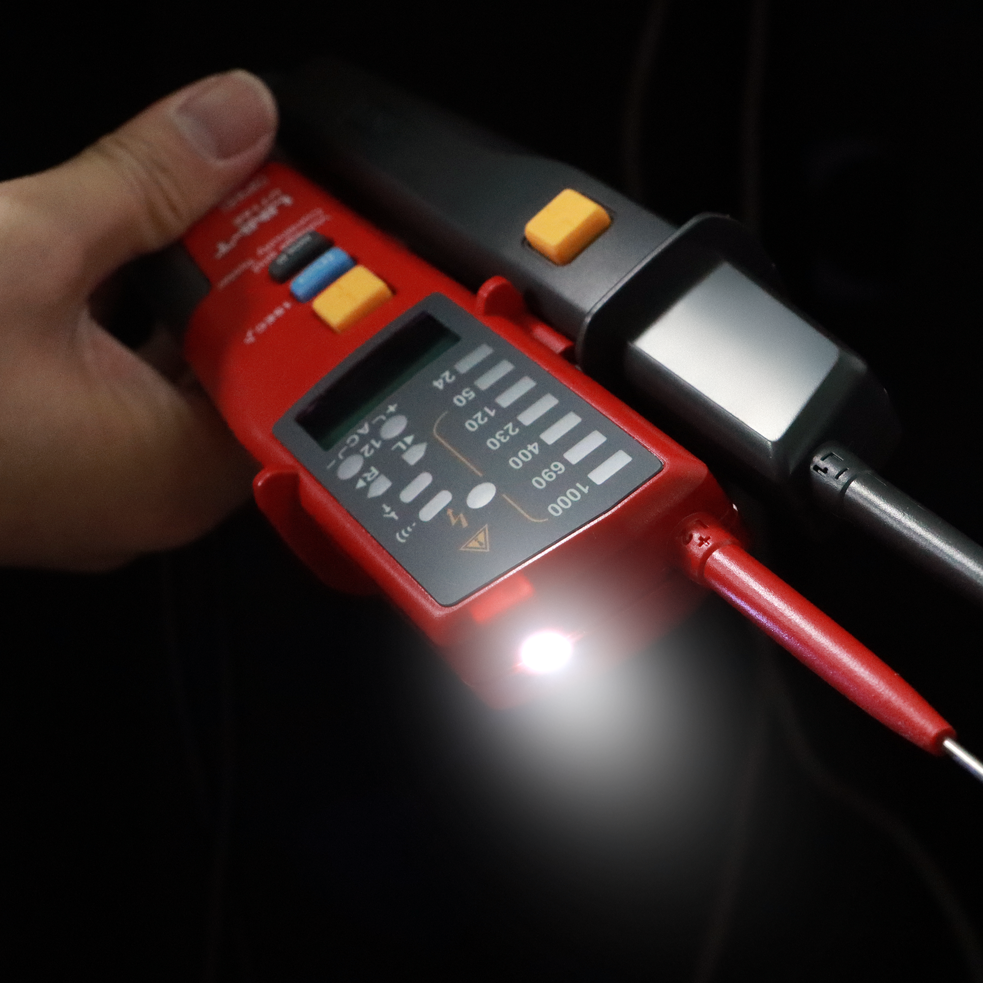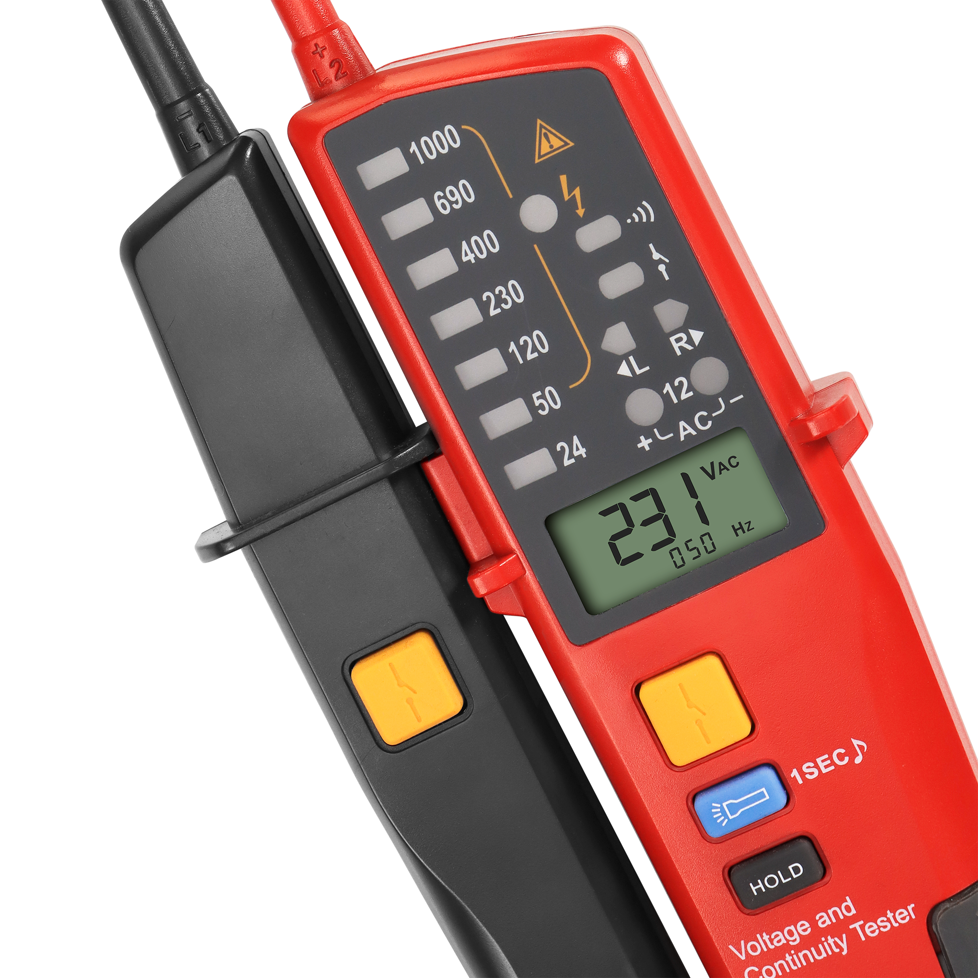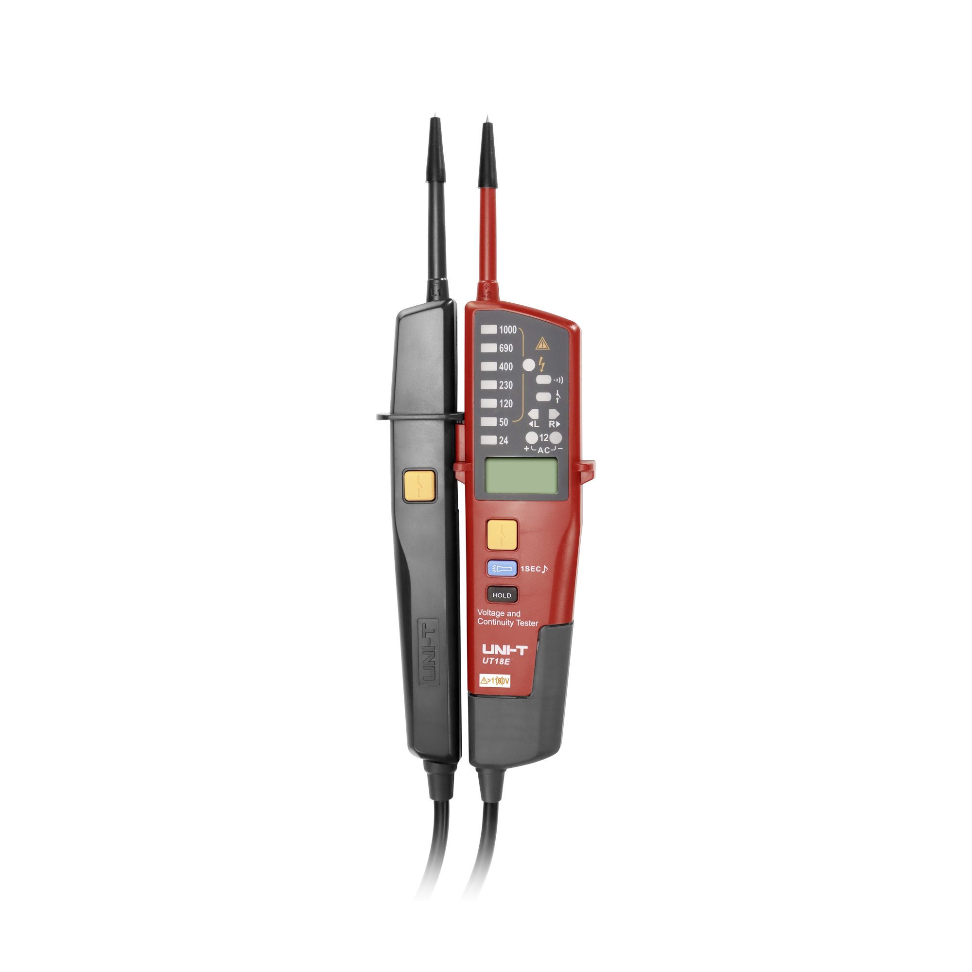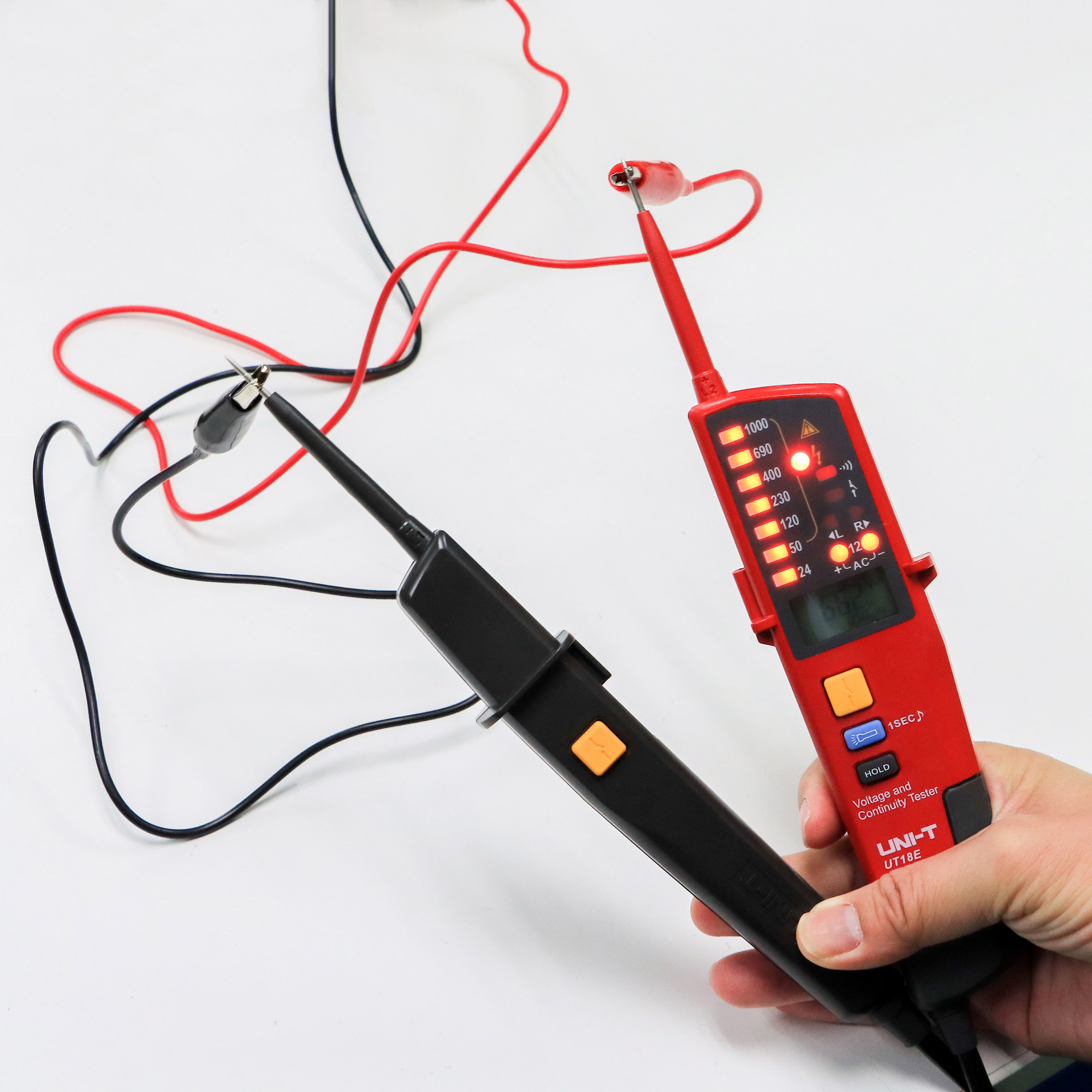 UT18E oferuje pomiar napięcia w szerokim zakresie od 6 V do 1000 V z wysoką dokładnością, która zmienia się w zależności od zakresu: od ±(1,5%+1) dla 6 V do ±(1,5%+5) dla 1000 V. Oprócz standardowego pomiaru napięcia, miernik umożliwia testowanie kolejności faz, ciągłości obwodu (do 60 k?) oraz detekcję polaryzacji. Wbudowany buzzer oraz wskaźniki LED ułatwiają pracę, a funkcja testowania RDC (230 V, 50 Hz ~ 400 Hz) dodaje wszechstronności.