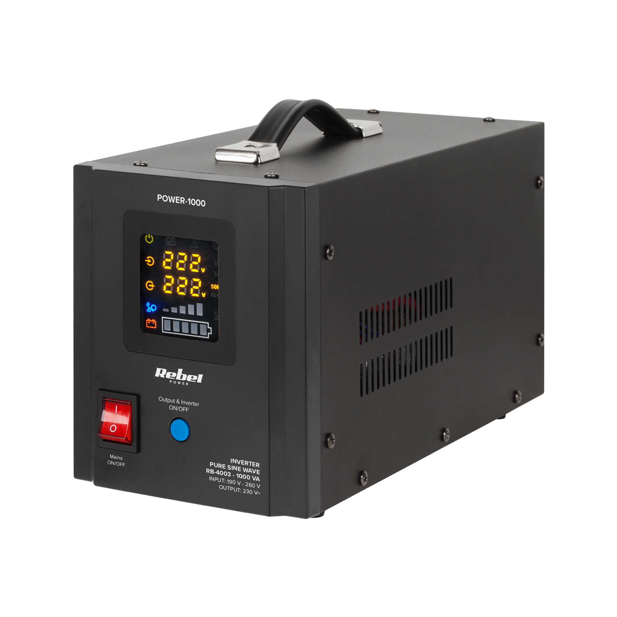 Komfortowe korzystnie z zasilacza awaryjnego Rebel gwarantuje czytelny wyświetlacz LED. Dzięki niemu możesz z łatwością odczytać aktualny status pracy urządzenia, sprawdzić m.in. poziom napięcia wejściowego, wyjściowego i częstotliwości. Co więcej szybko sprawdzisz też poziom obciążenia i poziom naładowania baterii.