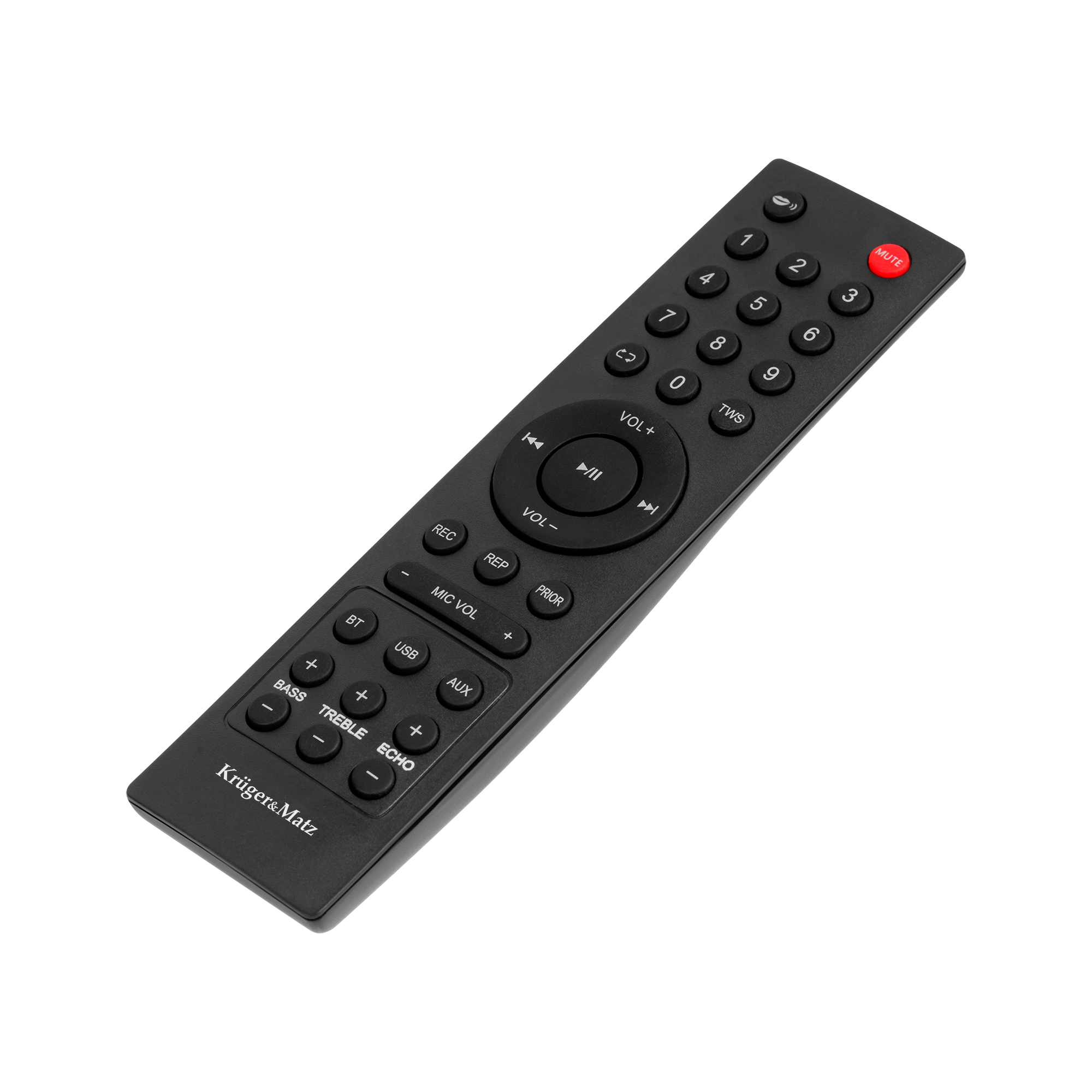 Dużo szersze możliwości obsługi głośnika Bluetooth Kruger&Matz Spiral, gwarantuje dołączony do zestawu pilot zdalnego sterowania. Dzięki niemu możesz swobodnie regulować brzmienie, nagrywać i odtwarzać dźwięki, czy wybierać źródła dźwięku.