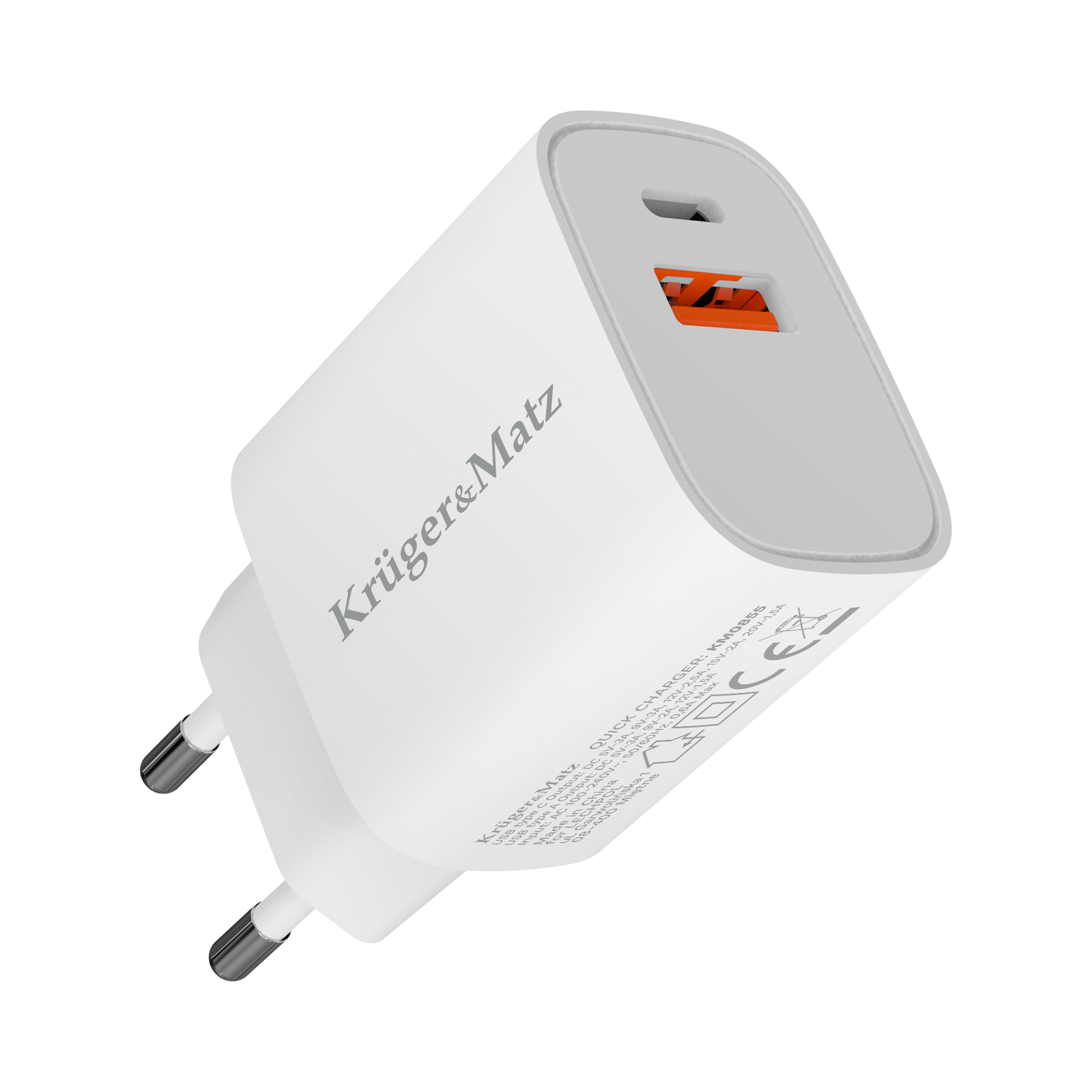 Kompaktowa obudowa ładowarki sieciowej KM0855 wyposażona została w dwa porty: USB typu A oraz USB typu C. Dzięki temu posiadając w domu odpowiednie typy kabli, tym jednym urządzeniem możesz zastąpić wiele innych zasilaczy.