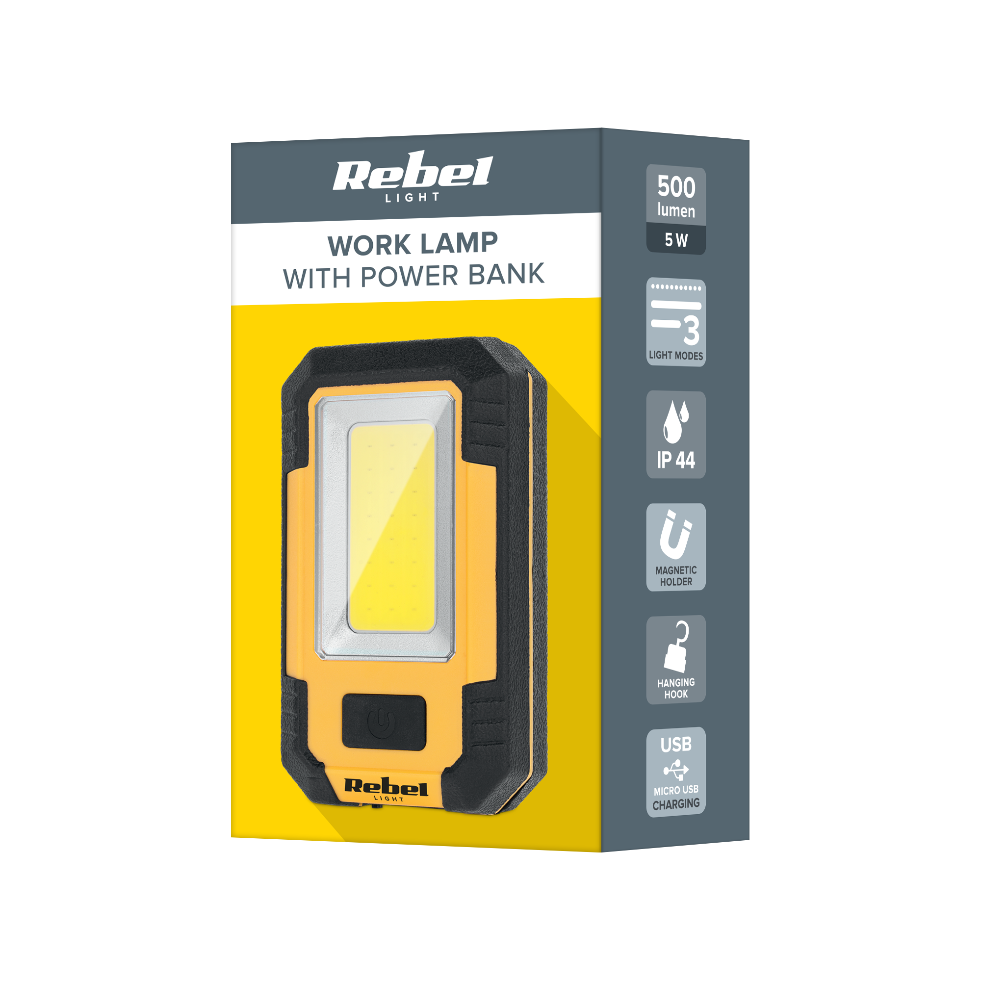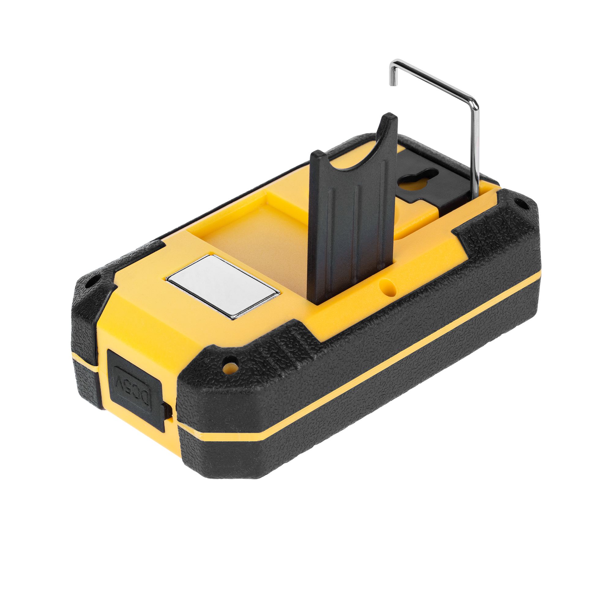 Lampa warsztatowa jest wyposażona w otwór do zawieszenia, hak, składaną podstawkę oraz uchwyt magnetyczny, co umożliwia elastyczne jej umiejscowienie w dowolnym miejscu. Konstrukcja z materiału ABS zapewnia trwałość i odporność na uszkodzenia, a stopień ochrony IP44 chroni przed bryzgami wody i pyłem, dzięki czemu lampa nadaje się do użytkowania w trudnych warunkach.