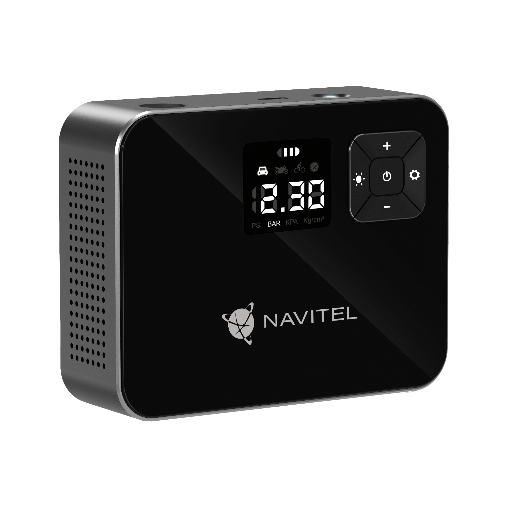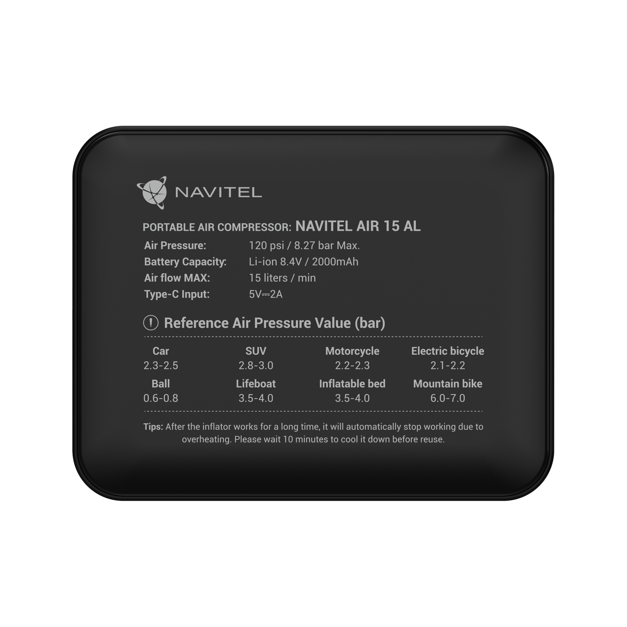 NAVITEL AIR 15 AL to akumulatorowy kompresor powietrza z automatycznym regulatorem ciśnienia, cyfrowym manometrem i wyświetlaczem LCD. AIR 15 AL pozwala bez kłopotu napompować koła samochodu, roweru, motocykla, piłkę lub zabawkę do pływania. Dzięki wbudowanemu akumulatorowi Li-ion o pojemności 2000 mAh kompresor działa autonomicznie - bez konieczności podłączenia do gniazdka elektrycznego czy sieci pokładowej pojazdu.