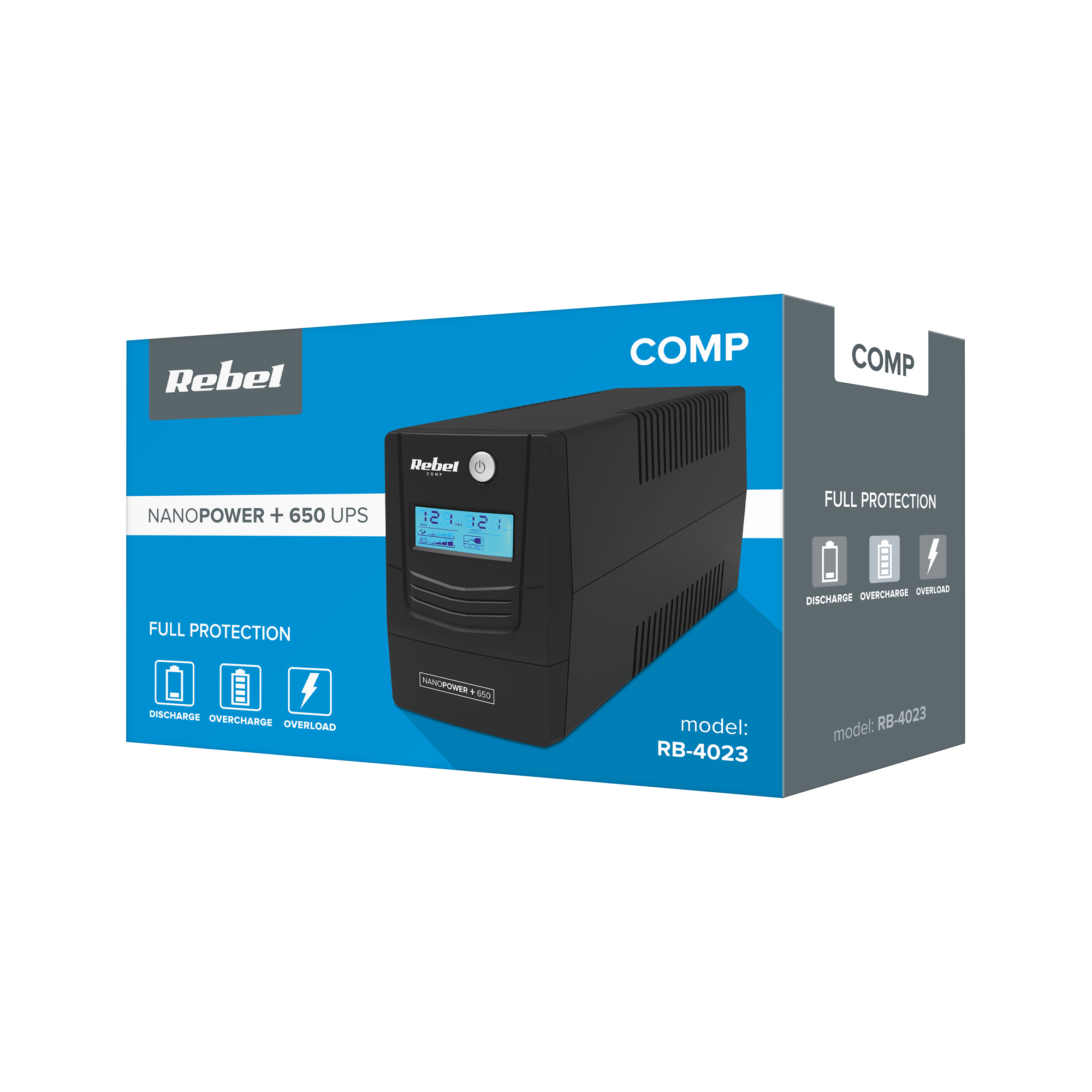 Zasilacze awaryjne Rebel wyróżniają się intuicyjną obsługą. Wystarczy podpiąć urządzenie do gniazda sieciowego i podłączyć do niego sprzęty takie jak komputer, laptop, router czy kasa fiskalna, a w przypadku awarii sieci energetycznej ich praca będzie kontynuowana. Co więcej, model RB-4023 wyposażony został w czytelny wyświetlacz LCD, na którym szybko sprawdzisz aktualny status pracy UPS'a.
