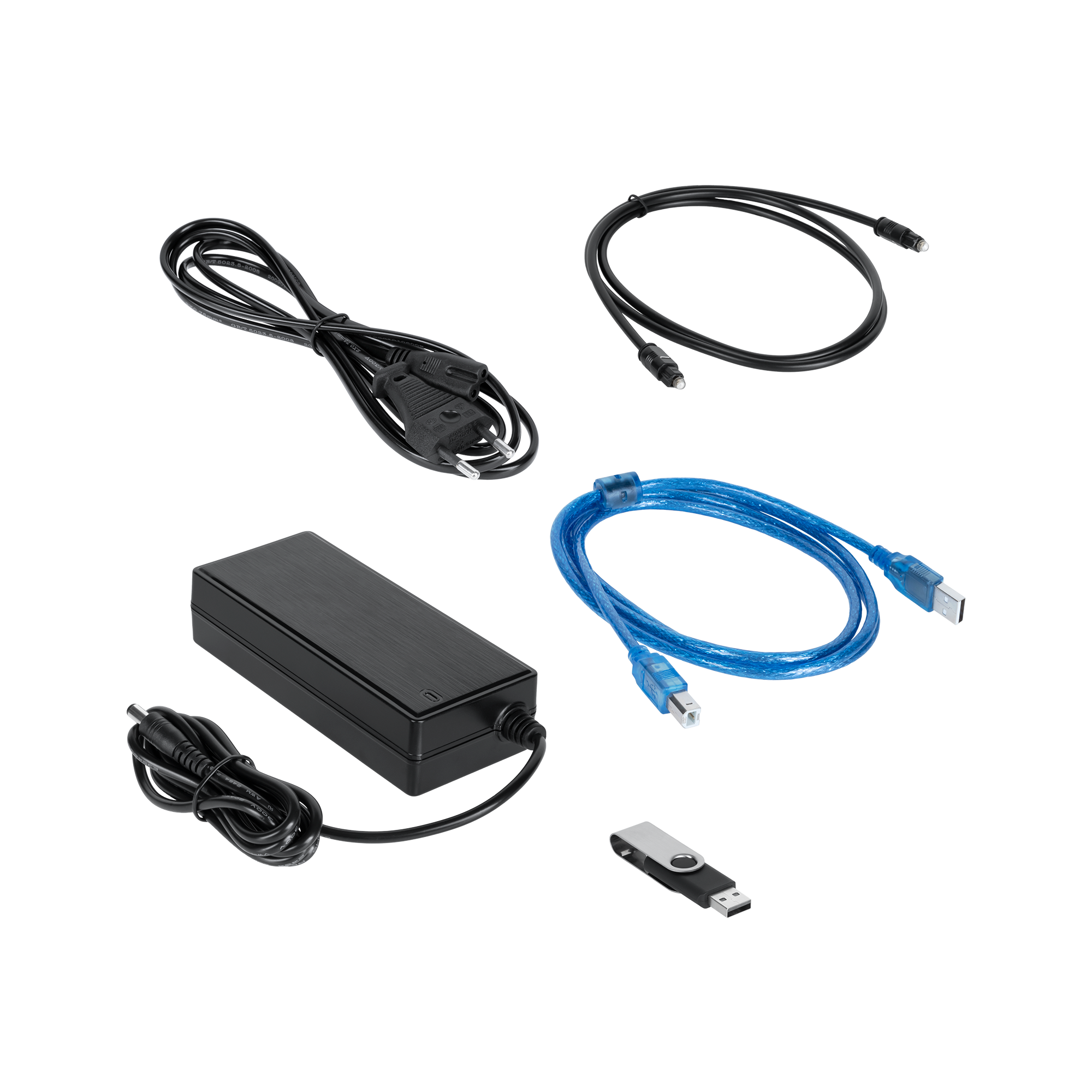 W zestawie: 2x lampa, pilot zdalnego sterowania, pendrive ze sterownikami, antena Bluetooth, kabel USB-B (142 cm), kabel optyczny (1 m), zasilacz sieciowy (3 m)