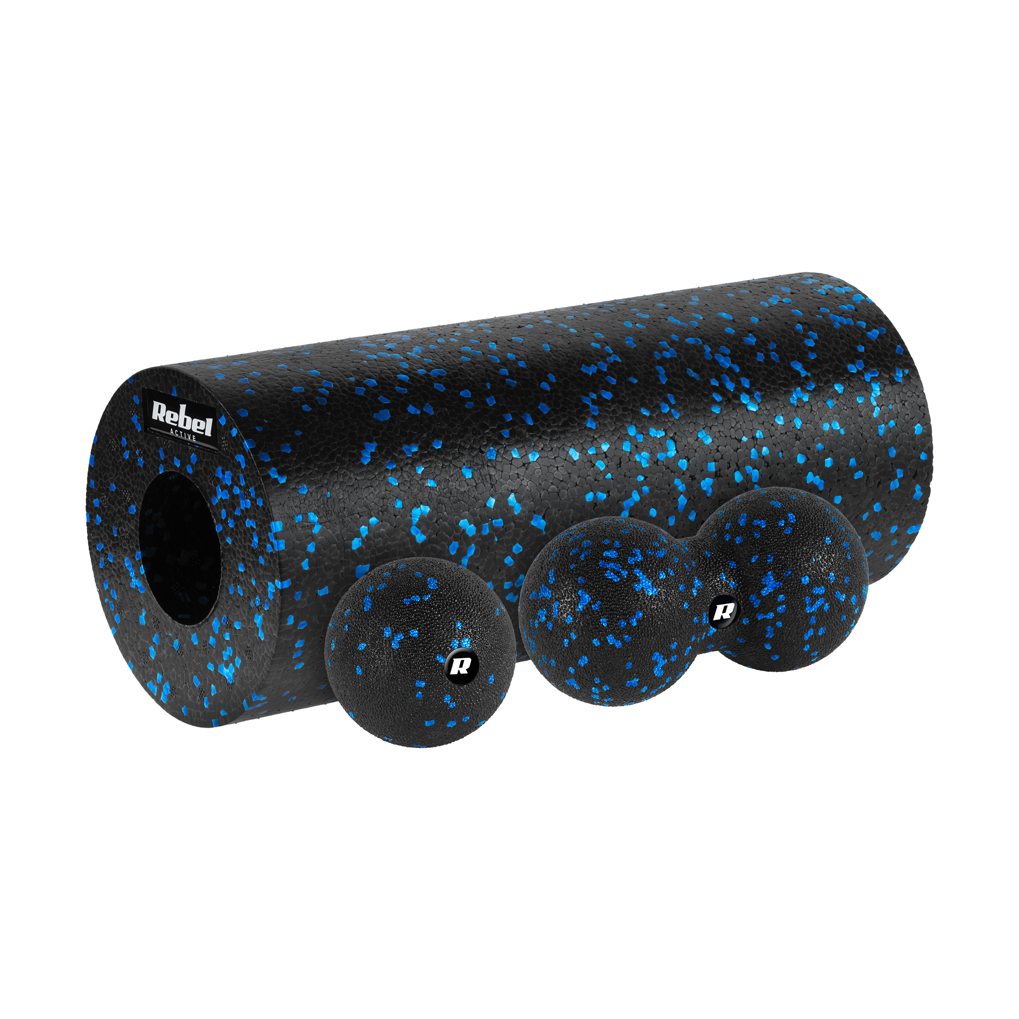 Zestaw wałek do masażu, roller, piłka, duoball REBEL ACTIVE, 3 elementy, kolor czarno-niebieski