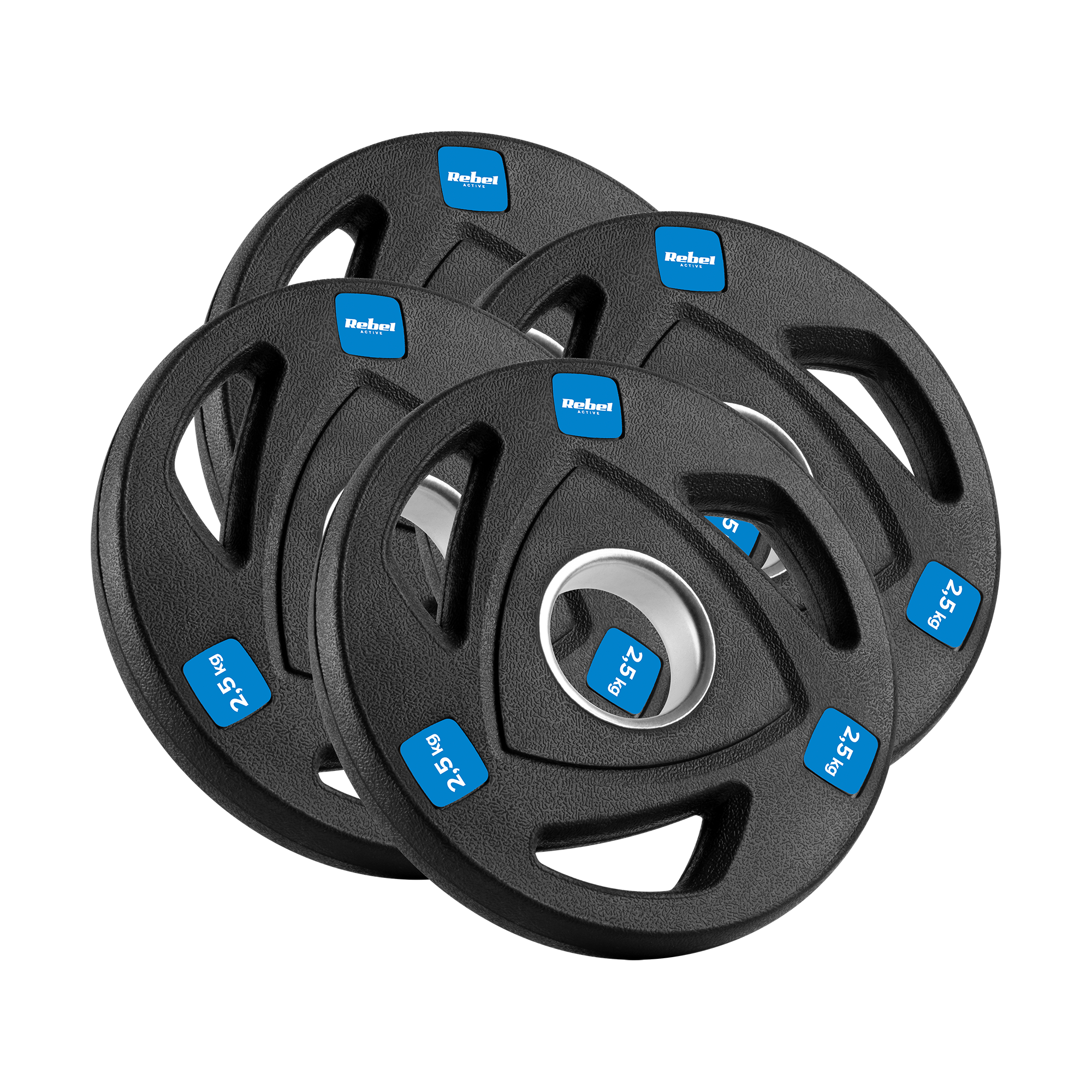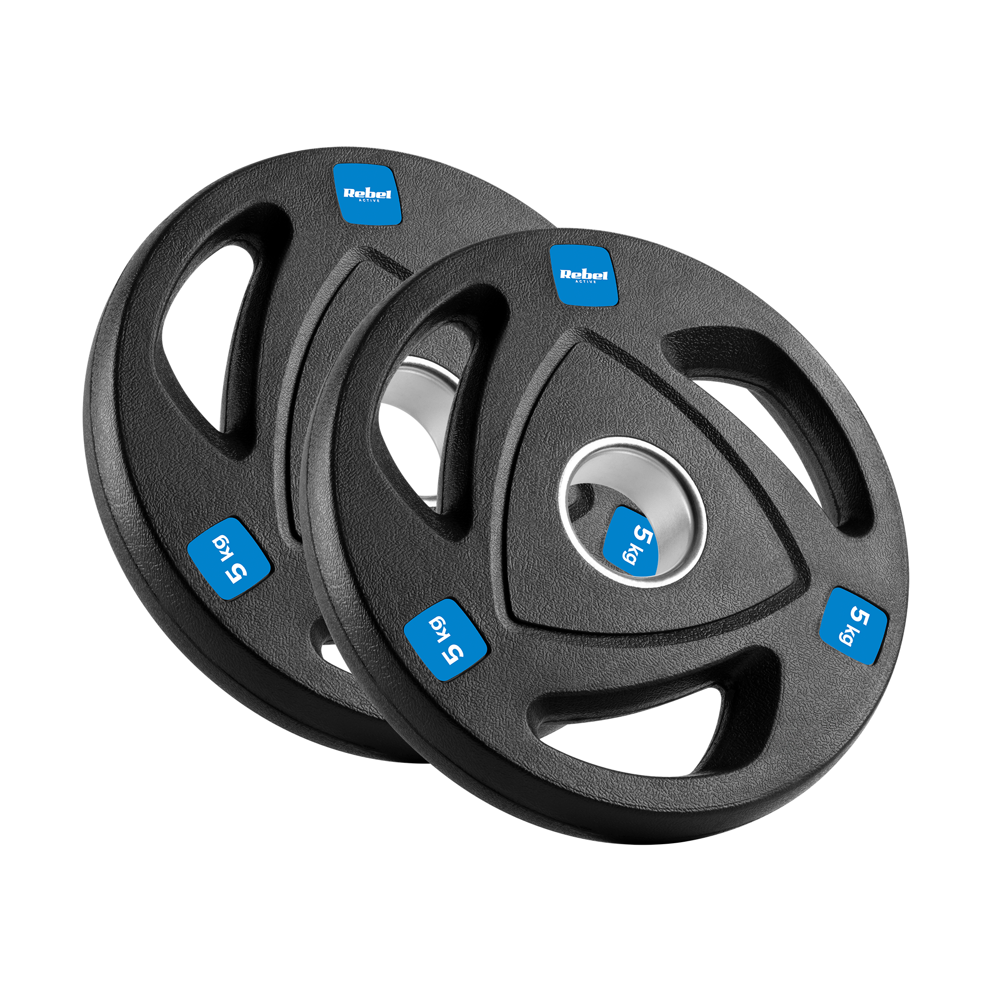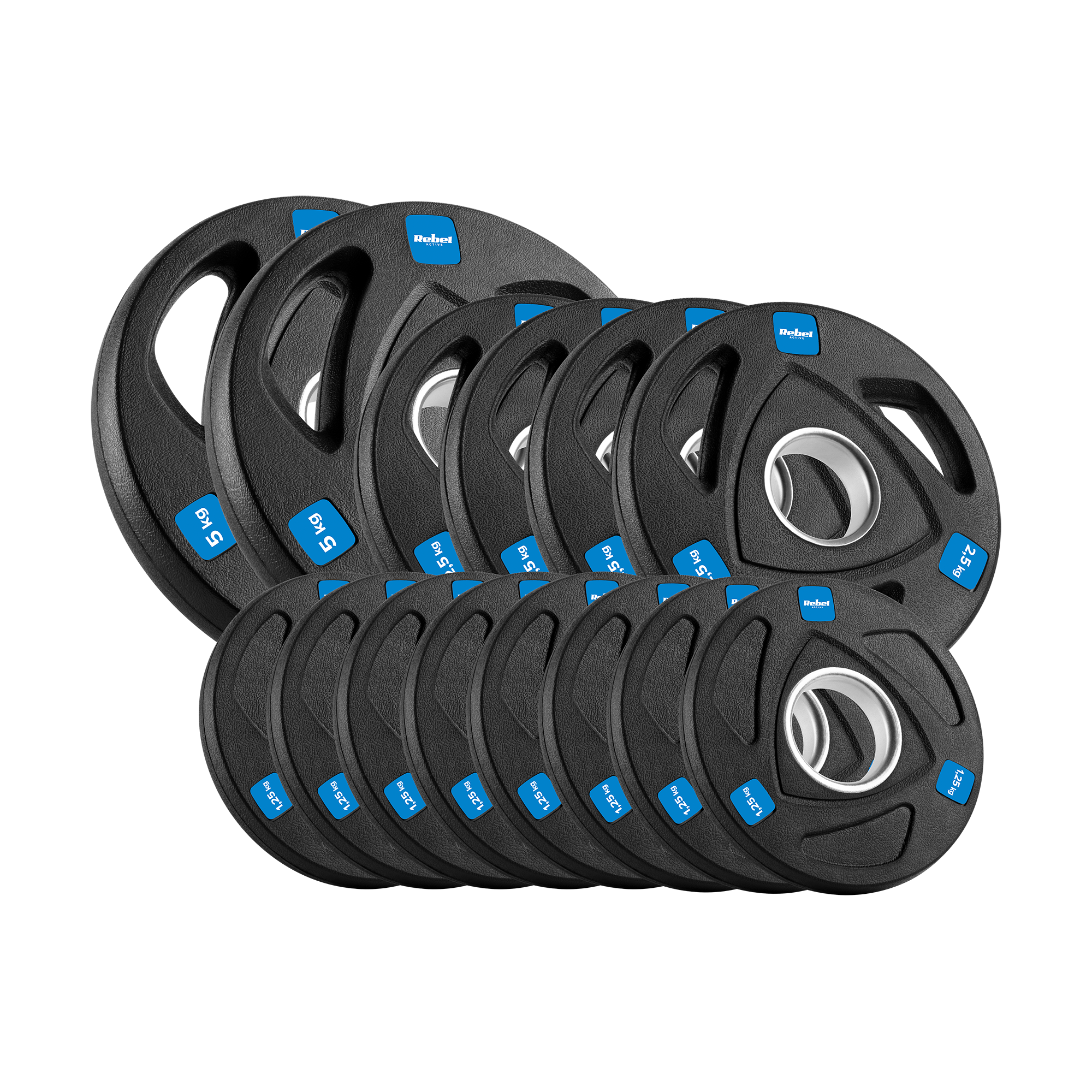 Zestaw Rebel Active pozwala trenować wznosy i przysiady przy pomocy samych ciężarków. Możesz też założyć obciążenia na gryf. Talerze mają większe otwory niż tradycyjne obciążenia, co pozwala na używanie ich z większością sztang olimpijskich. Otwór talerzy w zestawie RBA-2113 dopasowany jest do standardu gryfów olimpijskich i wynosi 51 mm.