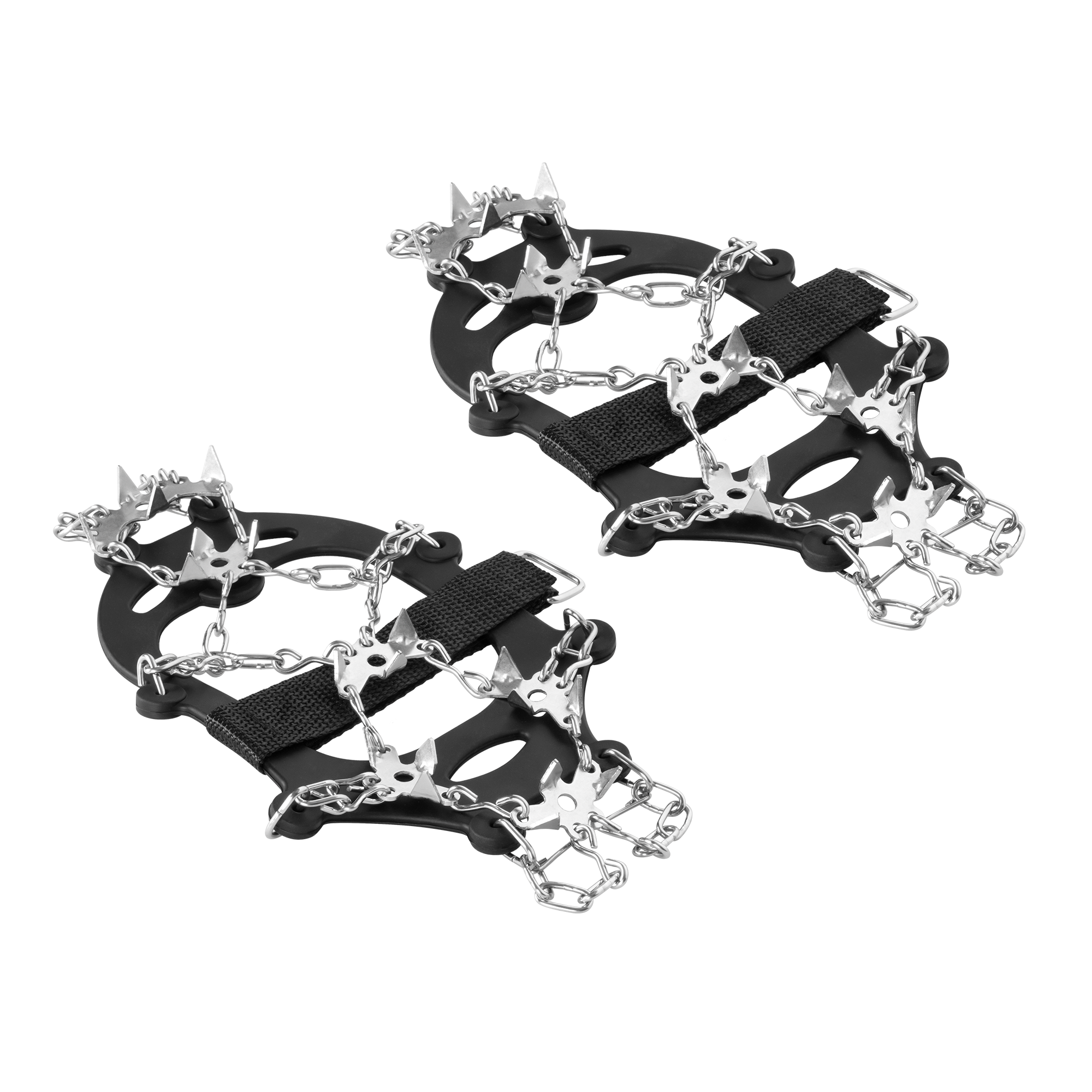 Raczki wyposażone są w 19 stalowych kolców o wysokości 14 mm, co zapewnia doskonałą przyczepność na śliskich powierzchniach. Kolce oraz łańcuchy wykonane są ze stali nierdzewnej, co gwarantuje ich odporność na korozję i trwałość. Silikonowa obejma jest elastyczna i dopasowuje się do różnych rozmiarów butów, zapewniając stabilność i komfort noszenia.