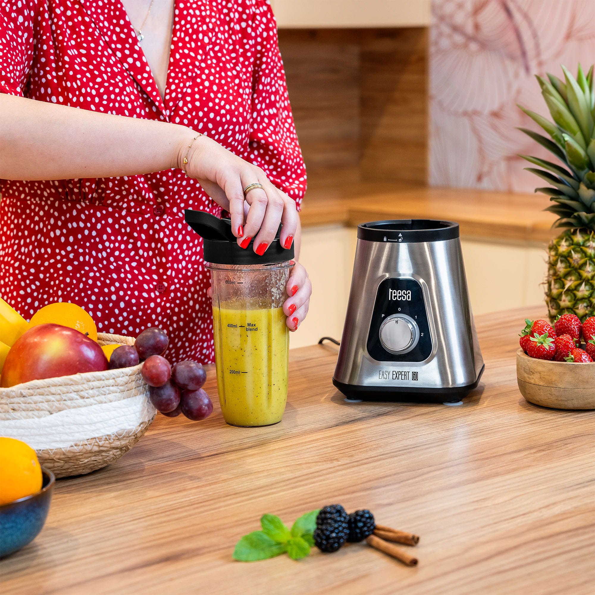 Blender kielichowy Teesa wyposażony jest w dodatkowy ,wykonany z trwałego tworzywa bidon, który można przykręcić bezpośrednio do ostrzy i bezpośrednio w nim zblendować warzywa i owoce. Jest to przydatne rozwiązanie dla osób, które chcą łatwo przygotować swoje ulubione koktajle, by zabrać je ze sobą np. do pracy.