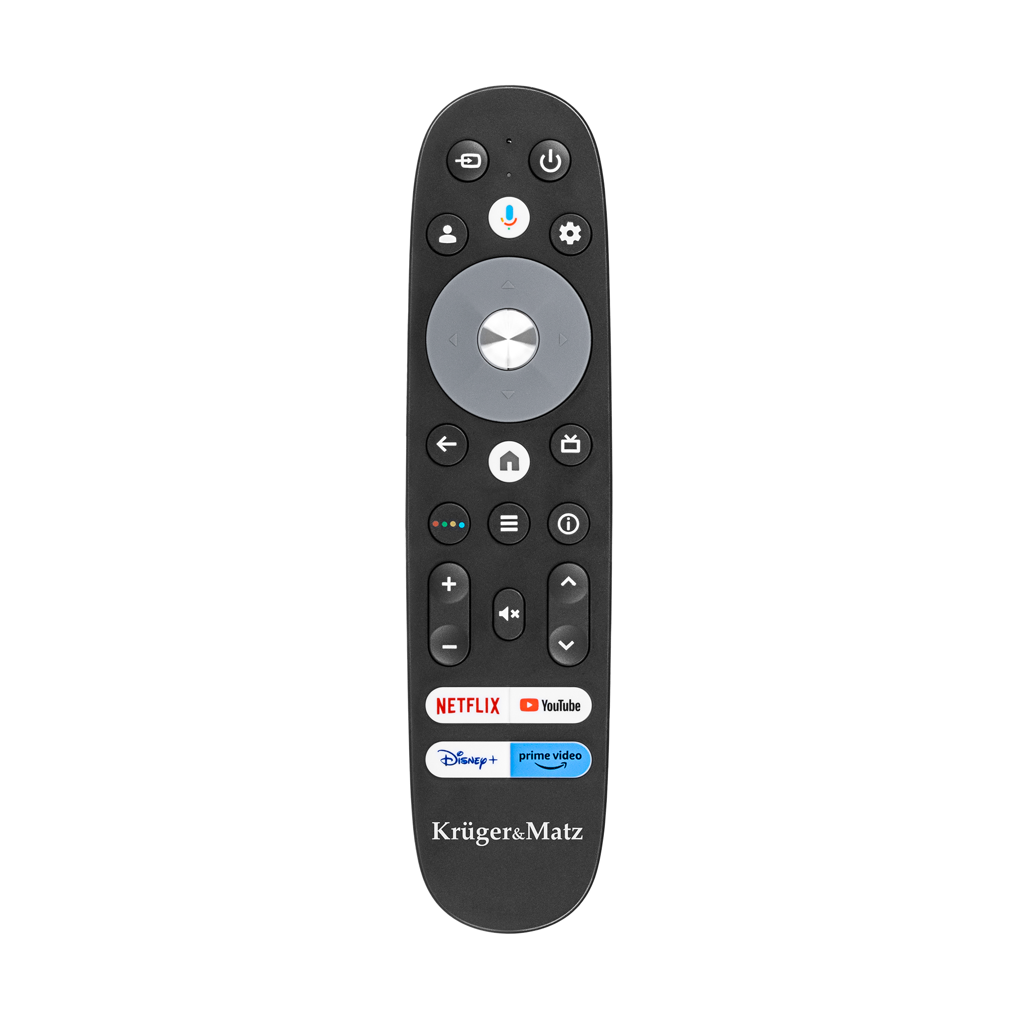 Dołączony do telewizora Kruger&Matz pilot został zaprojektowany z myślą o wygodnym i intuicyjnym użytkowaniu. Na pilocie znajdują się skróty do najpopularniejszych aplikacji, takich jak Netflix, YouTube czy Amazon Prime Video. Dzięki nim możesz szybko uruchomić ulubione treści bez konieczności przeglądania menu czy wyszukiwania aplikacji.
