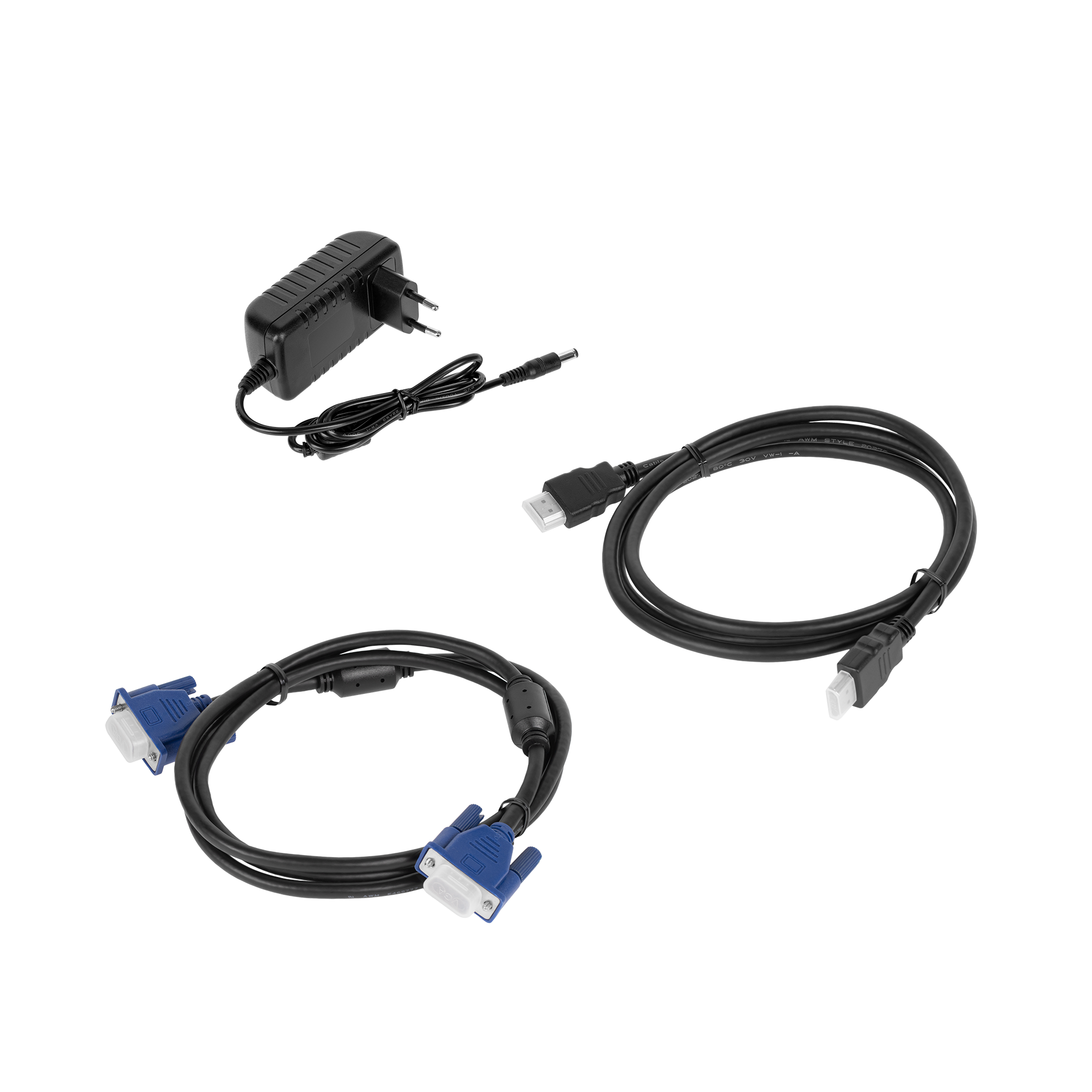 Zasilacz (145 cm), instrukcja obsługi, kabel HDMI (150 cm), kabel VGA (150 cm)
