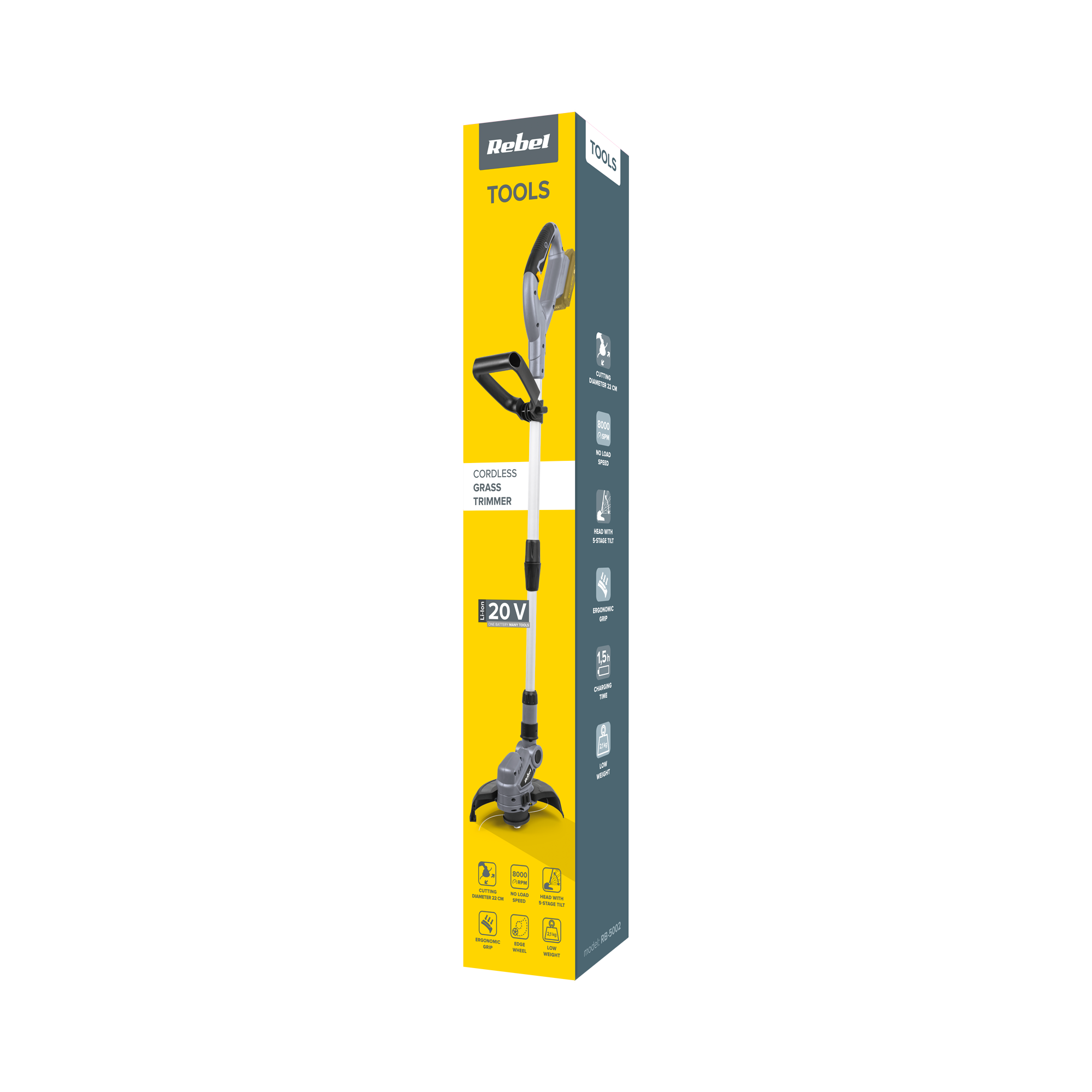 Akumulator i ładowarka sprzedawane są oddzielnie. Jeśli więc Twój ogród jest bardzo wymagający, wybierz z oferty Rebel Tools wymienne baterie akumulatorowe 20 V, 2 A, które pozwolą Ci pracować bez zbędnych długich przerw na ładowanie.