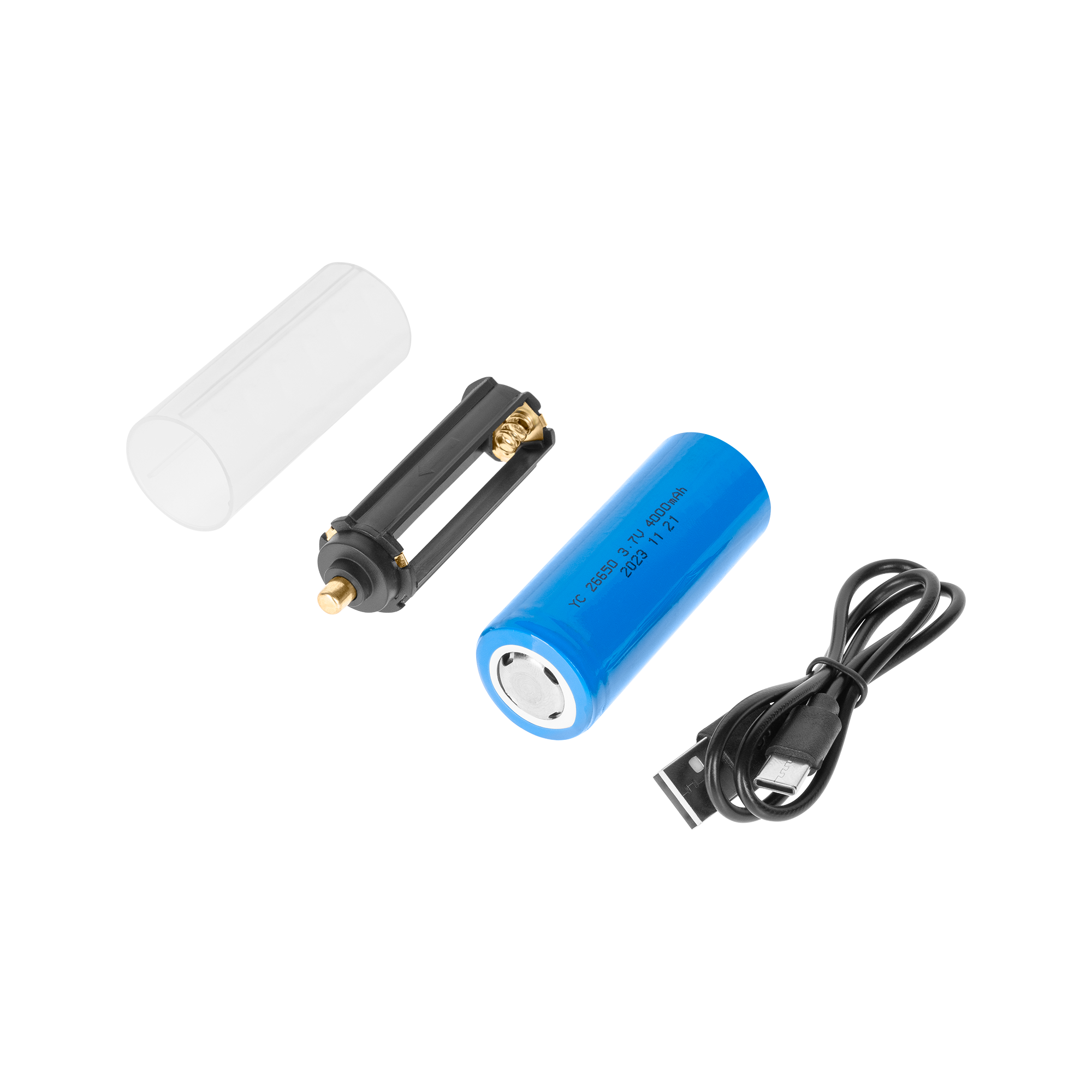 Oferuje stopień ochrony IP65, co oznacza odporność na kurz i wodę, umożliwiając użytkowanie w trudnych warunkach pogodowych. W zestawie znajduje się kabel USB-C (45 cm), adapter do akumulatora 18650 oraz adapter na baterie AAA, co zapewnia różne opcje zasilania latarki.