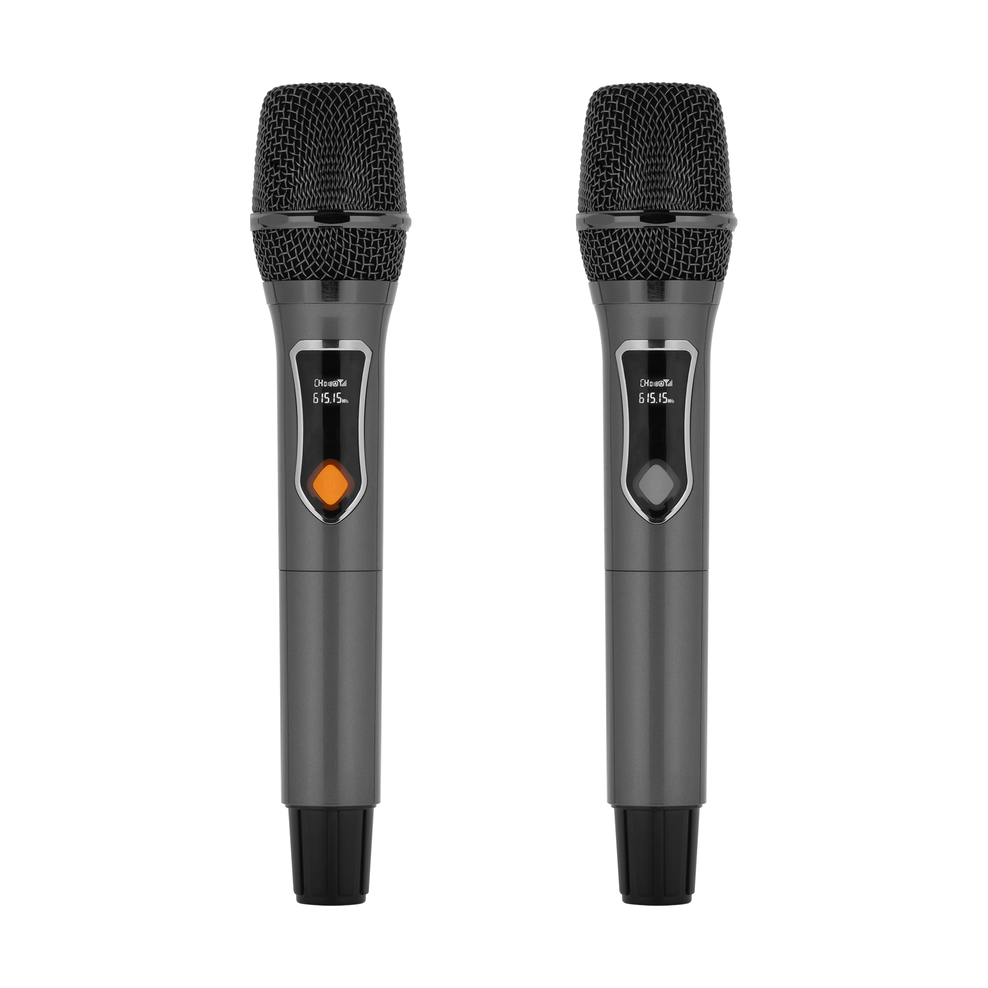 W zestawie: 2 mikrofony bezprzewodowe, pilot zdalnego sterowania