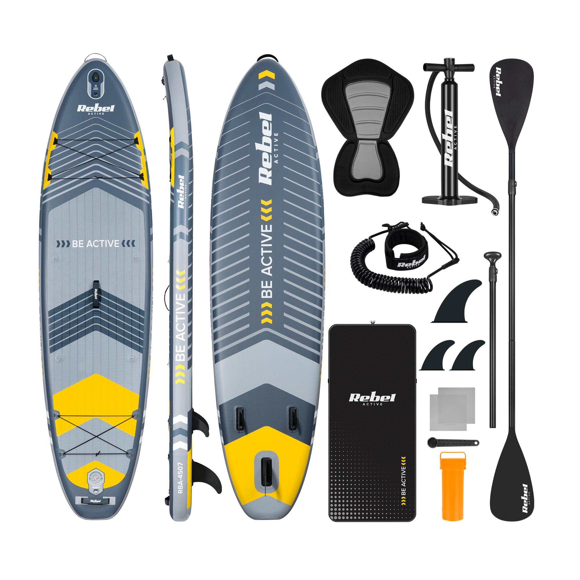 W zestawie z deską SUP RBA-4507 otrzymasz pompkę ręczną z manometrem, która umożliwia szybkie i efektywne napełnianie jej powietrzem. Co więcej, dla jeszcze większej wygody dołączony został także plecak transportowy, który ułatwi Ci przechowywanie i transport deski. Oferta dotyczy deski w kolorze szarym. Pozostałe kolory dostępne są w oddzielnych ofertach