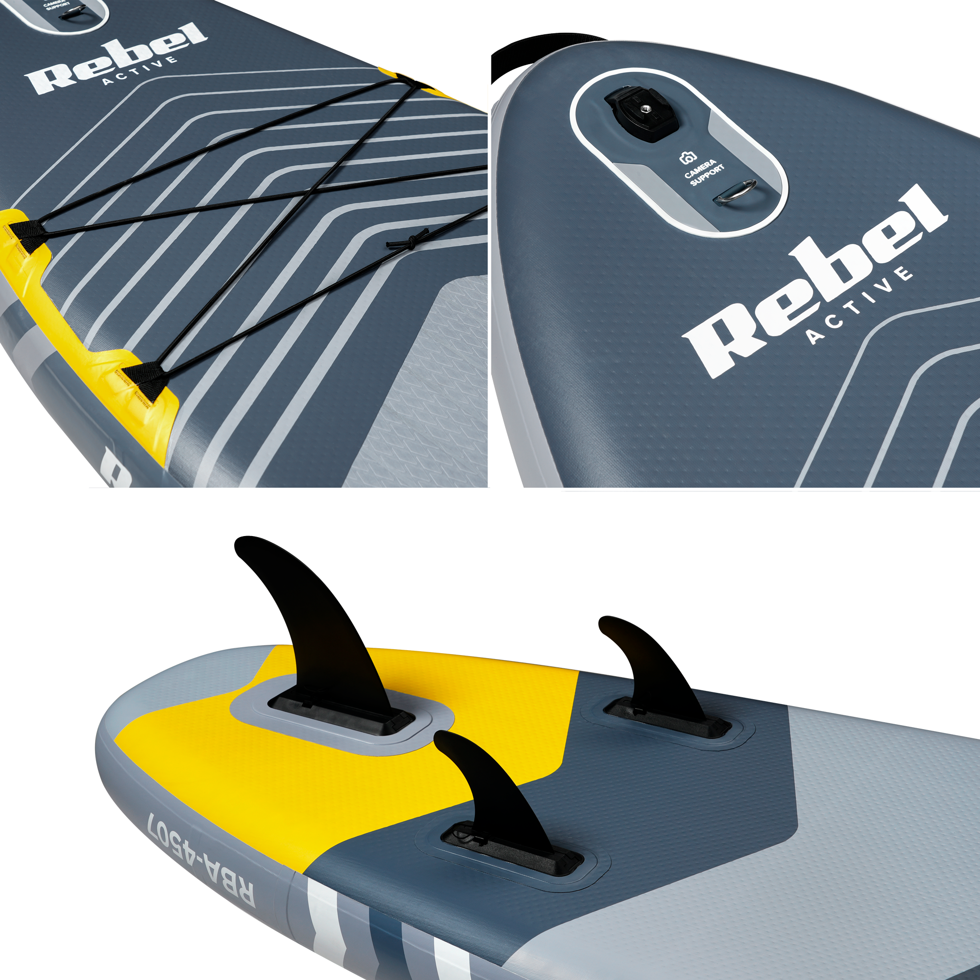Deska RBA-4507 posiada trzy stateczniki typu slide-in – jeden większy centralny i dwa mniejsze po bokach. Takie wyposażenie stanowi idealną równowagę pomiędzy stabilnością i zwrotnością. Dodatkowe stateczniki boczne poprawiają kontrolę podczas zakrętów i pozwalają na bardziej dynamiczne ruchy np. w czasie surfowania.