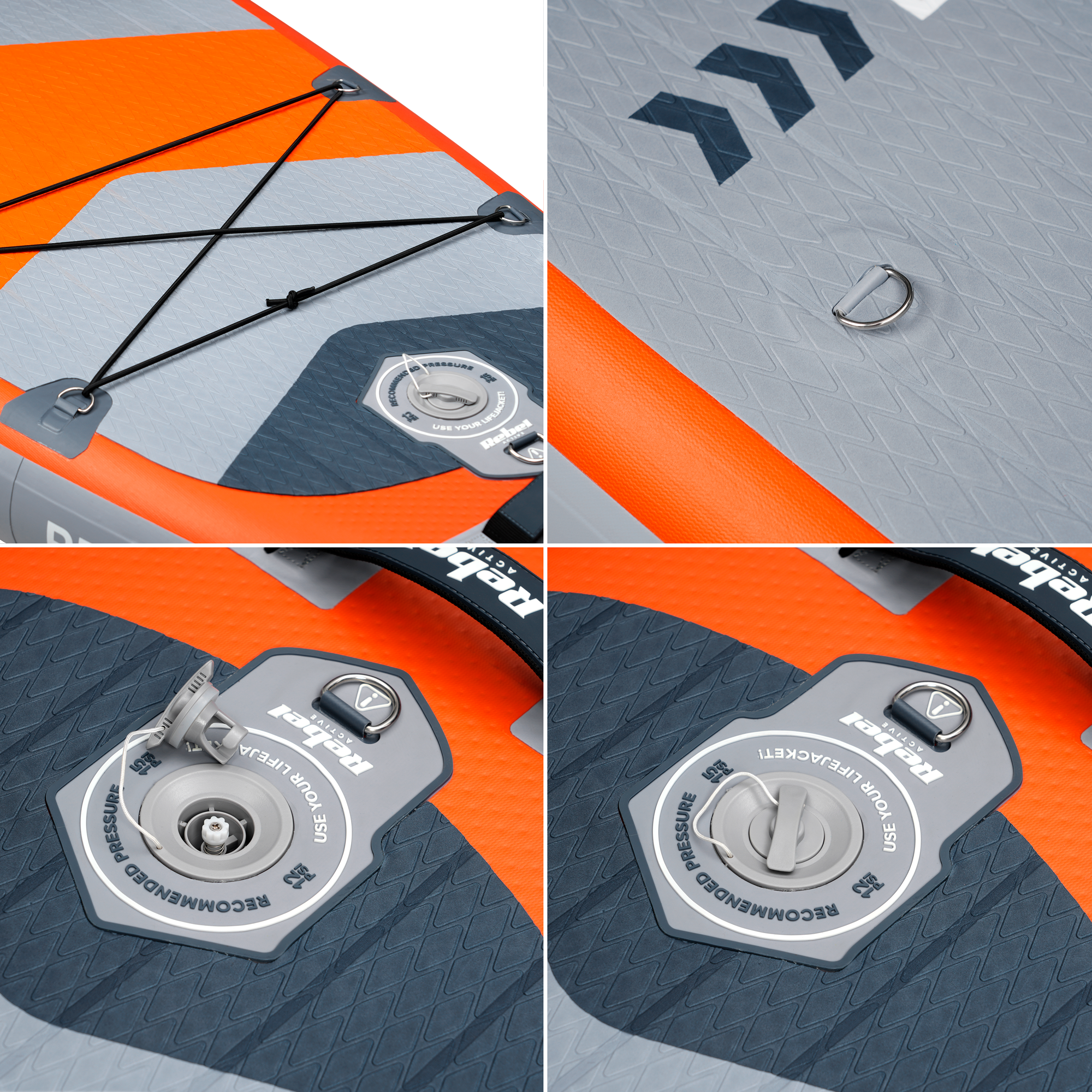 Dzięki dwóm uchwytom do przenoszenia - centralnemu i tylnemu - transportowanie na brzegu deski SUP Rebel Active jest łatwe i wygodne. Z kolei zintegrowane uchwyty bagażowe z linką mocującą na dziobie, umożliwiają bezpieczne przewożenie niezbędnych rzeczy podczas wodnych eskapad.