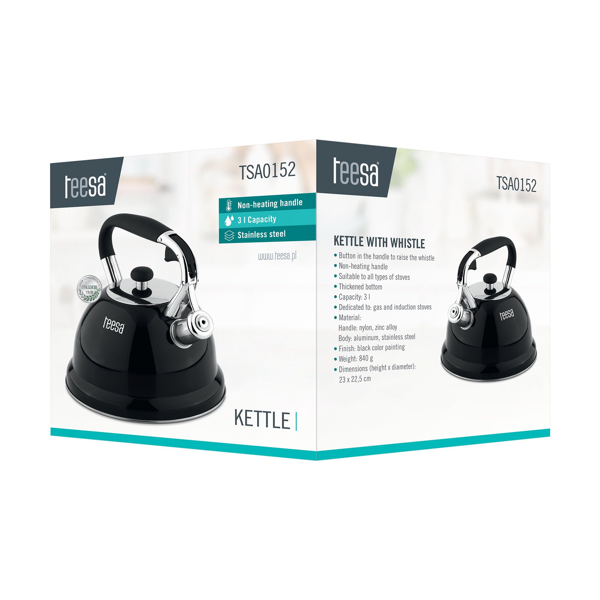 Stylowe wykonanie czajnika Teesa sprawi, że będzie doskonale prezentował się w Twojej kuchni. Uchwyt z wytrzymałego nylonu, korpus ze stali nierdzewnej i eleganckie wykończenie w czarnym połysku tworzą nowoczesny design, zapewniając przy tym łatwość w czyszczeniu.