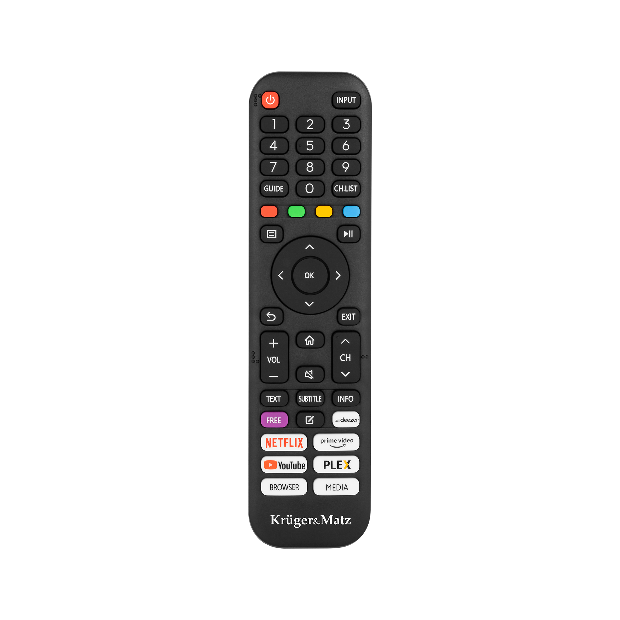 Dołączony do telewizora Kruger&Matz pilot został zaprojektowany z myślą o wygodnym i intuicyjnym użytkowaniu. Na pilocie znajdują się skróty do najpopularniejszych aplikacji, takich jak Netflix, YouTube czy Amazon Prime Video. Dzięki nim możesz szybko uruchomić ulubione treści bez konieczności przeglądania menu czy wyszukiwania aplikacji.