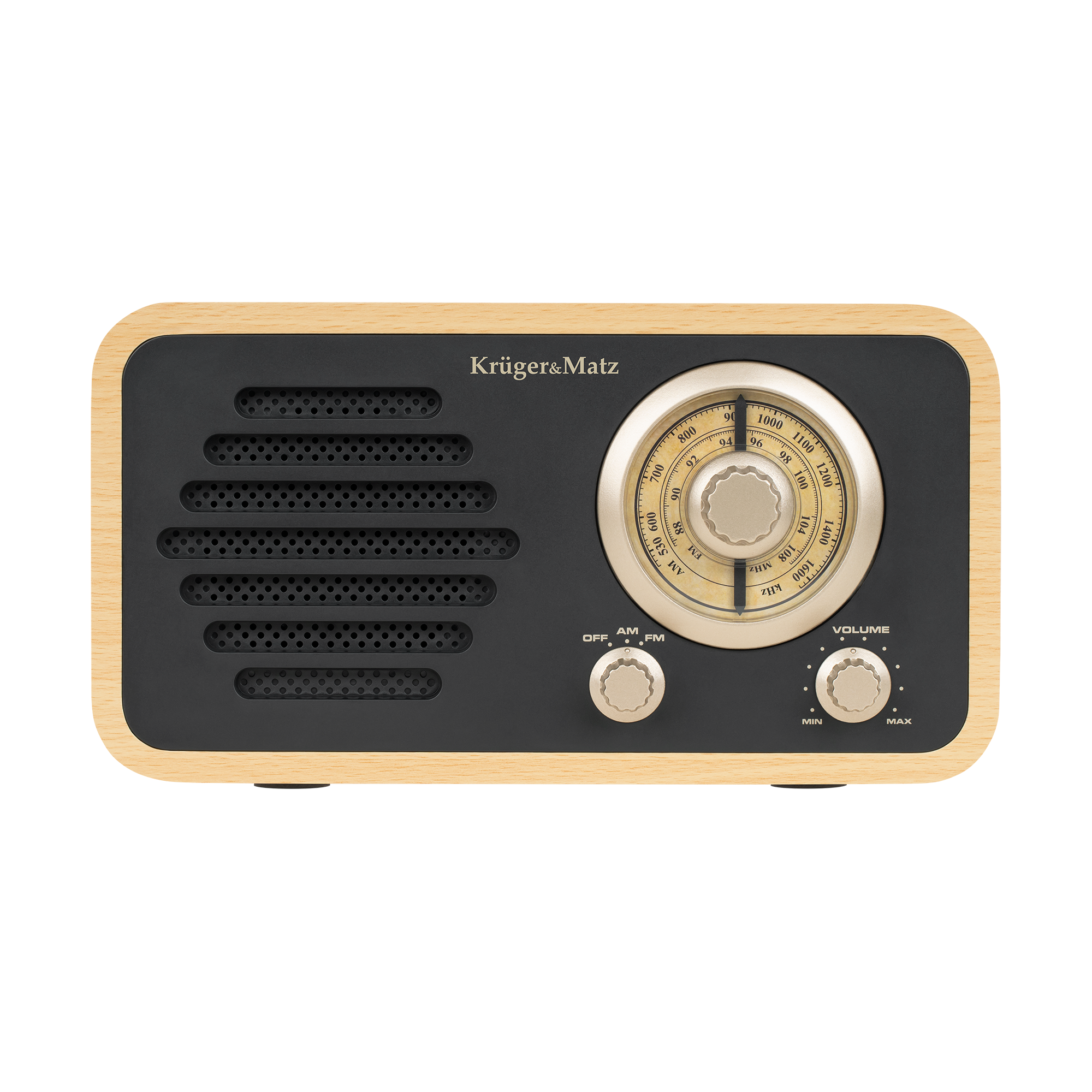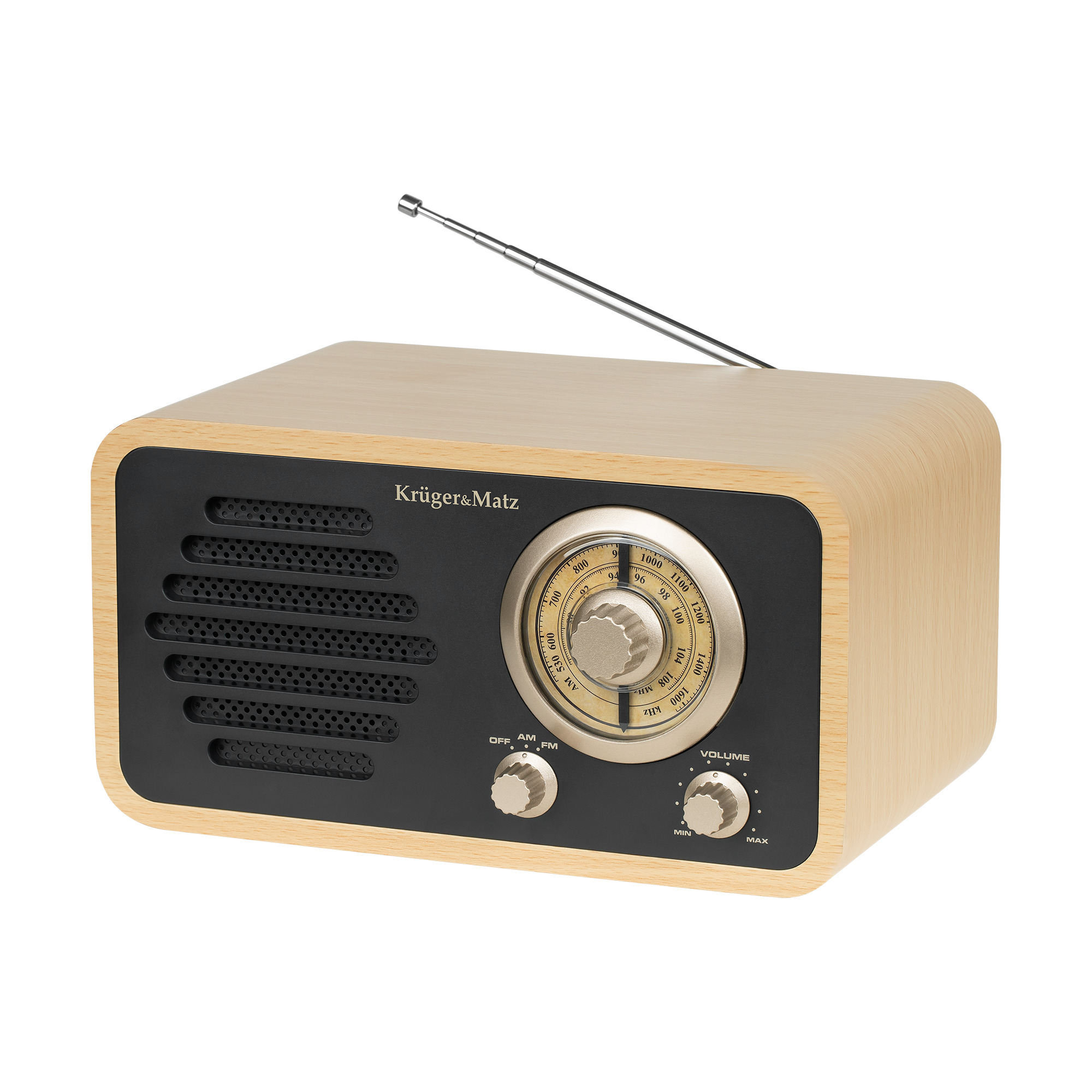 Radio Kruger&Matz zachwyca swoim unikatowym stylem. Drewniana obudowa w połączeniu z czarnym frontem i złotymi pokrętłami tworzy elegancki, retro wygląd. Ten design doskonale wpasuje się zarówno w klasyczne, jak i nowoczesne wnętrza, stając się ich niepowtarzalną ozdobą.