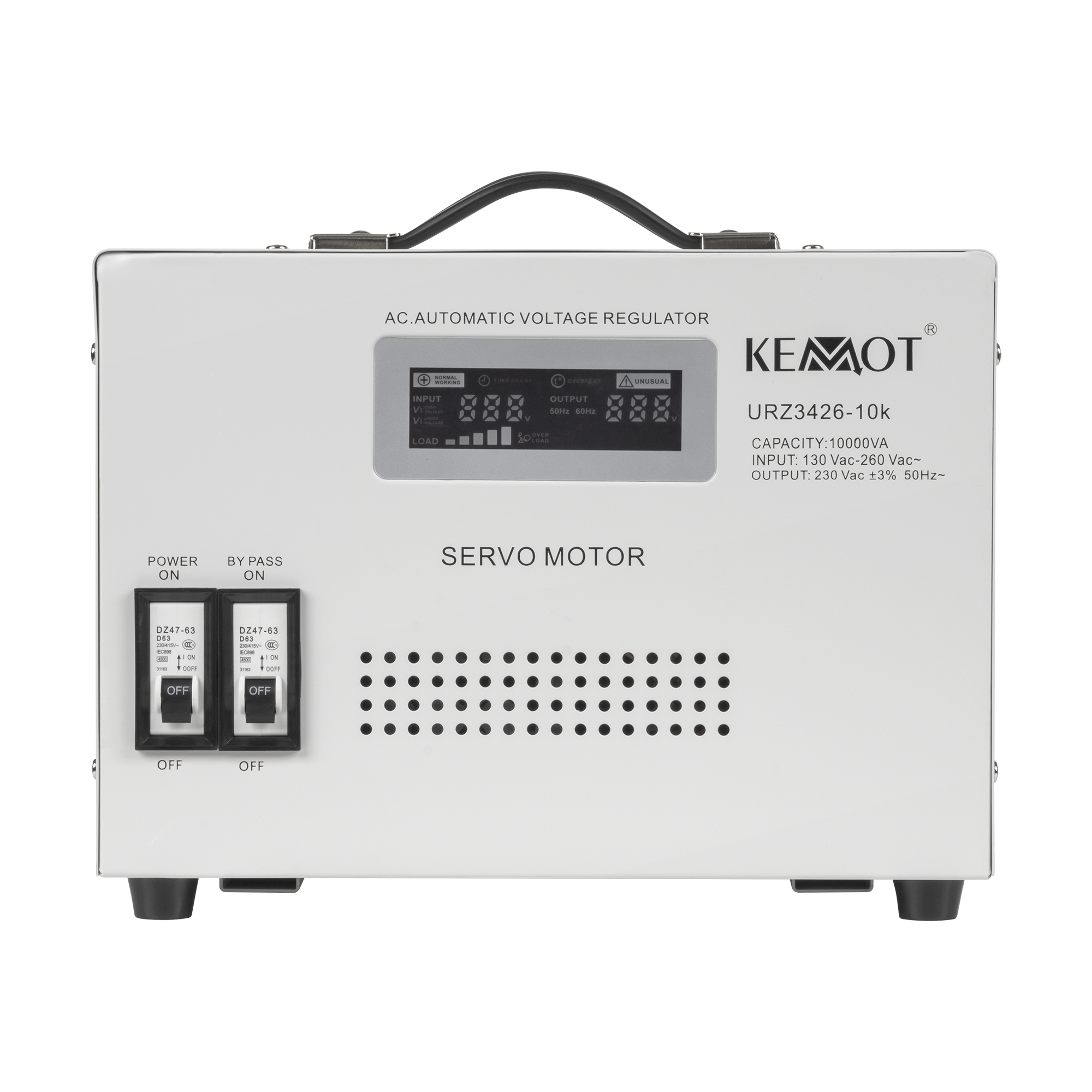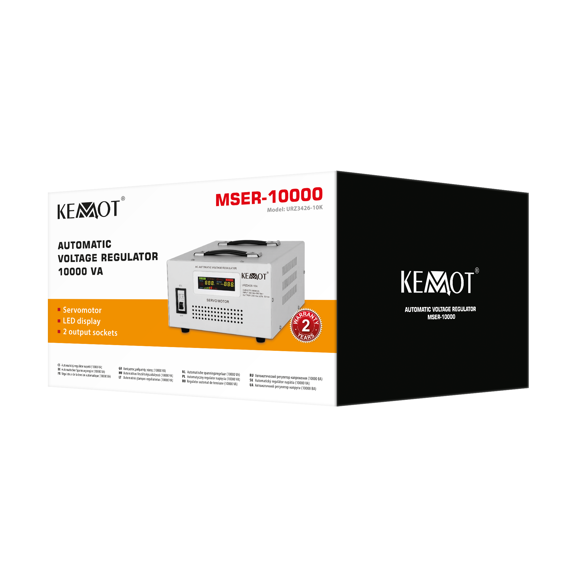 KEMOT MSER-10000 to stabilizator napięcia o mocy 10 000 VA, który pozwala utrzymać stałe napięcie 230 V przy zmiennym napięciu wejściowym w zakresie 130-260 V. Przeznaczony jest do zastosowań domowych, biurowych i przemysłowych, gdzie konieczna jest stabilizacja zasilania.
