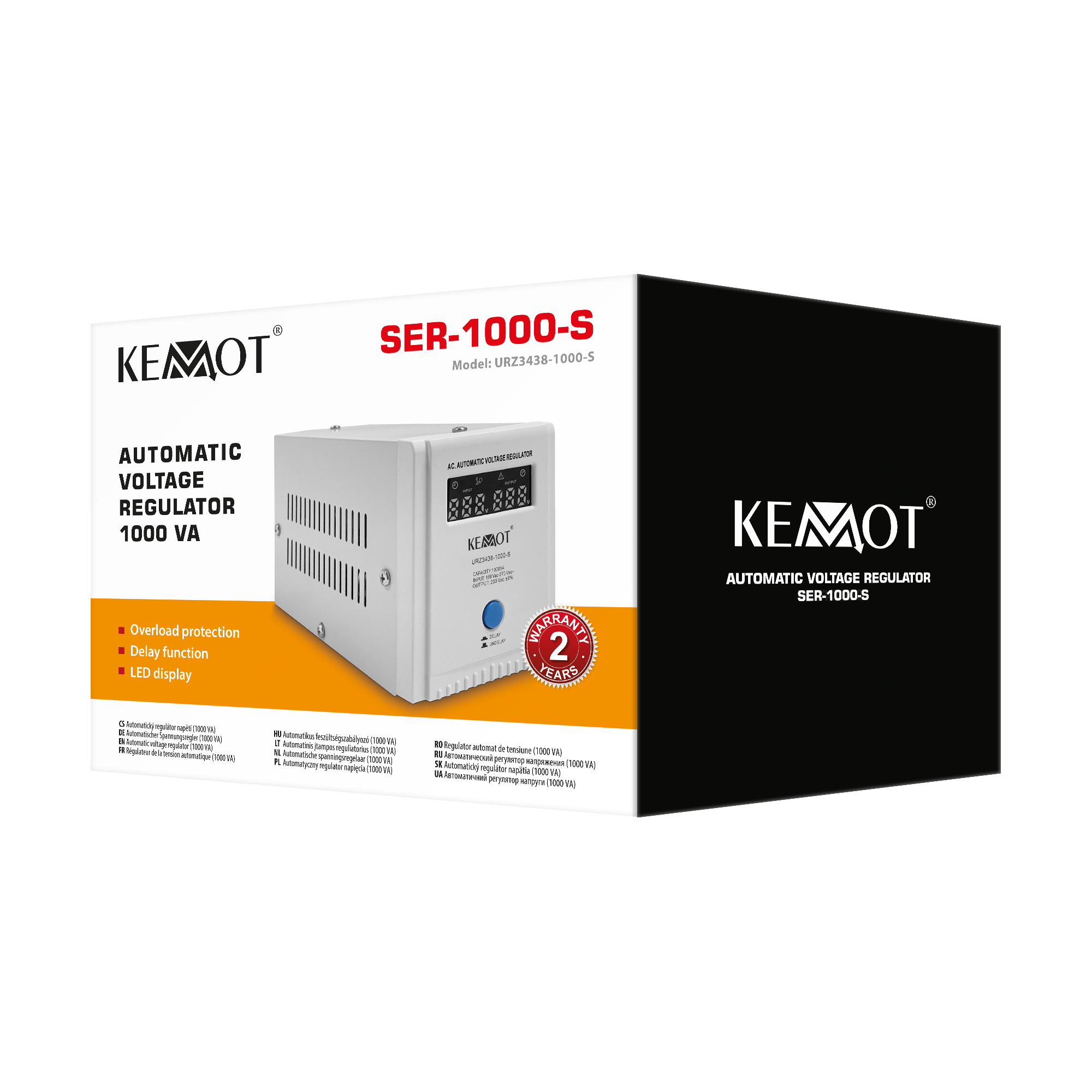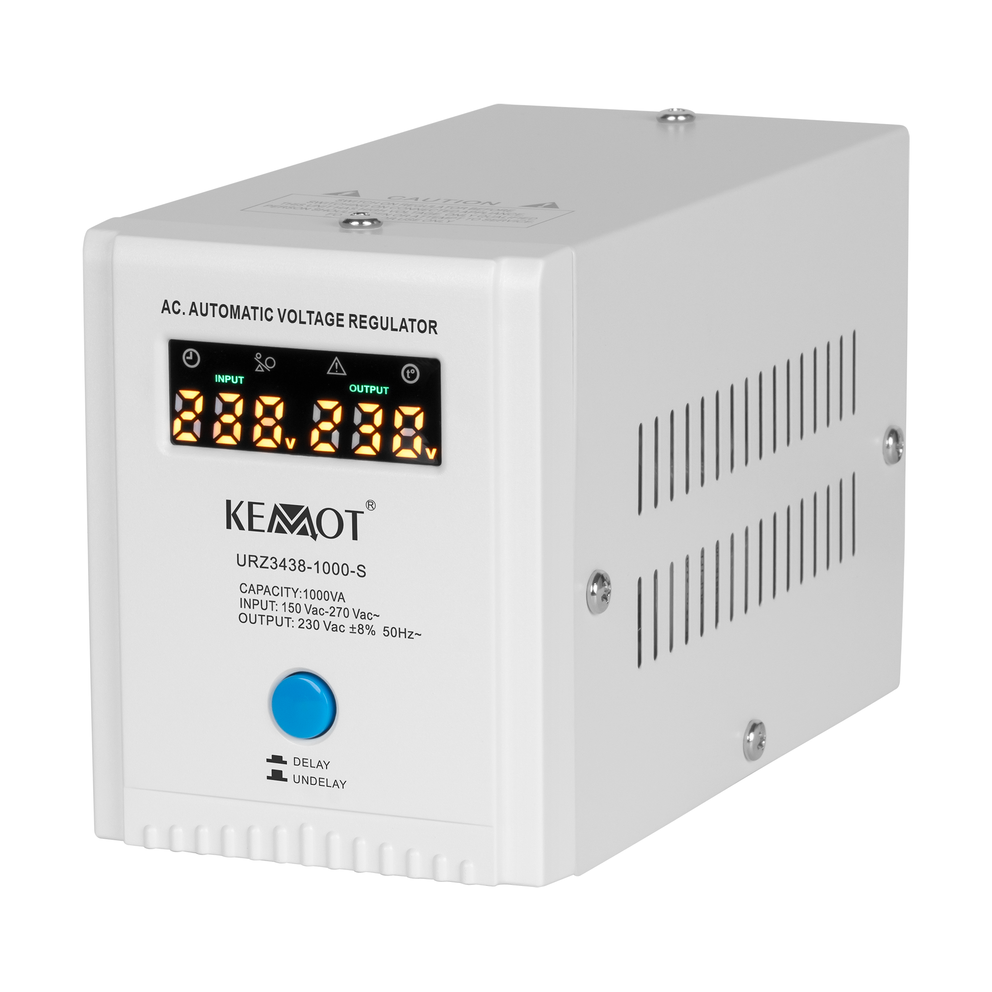 Jeśli potrzebujesz stabilizatora napięcia do urządzeń posiadających duży chwilowy prąd rozruchowy wybierz model wyposażony w funkcję opóźnienia załączenia DELAY. KEMOT SER-1000-S, został wyposażony w przycisk opóźnienia załączania DELAY w zakresie od 6 do 180 sekund, co obniży ryzyko jego uszkodzenia, gdy podłączone do niego urządzenia mają duży chwilowy prąd rozruchowy. Ponadto stabilizator SER-1000-S posiada zabezpieczenia przed zbyt wysokim i niskim napięciem, przeciążeniem, przegrzaniem i zwarciem.