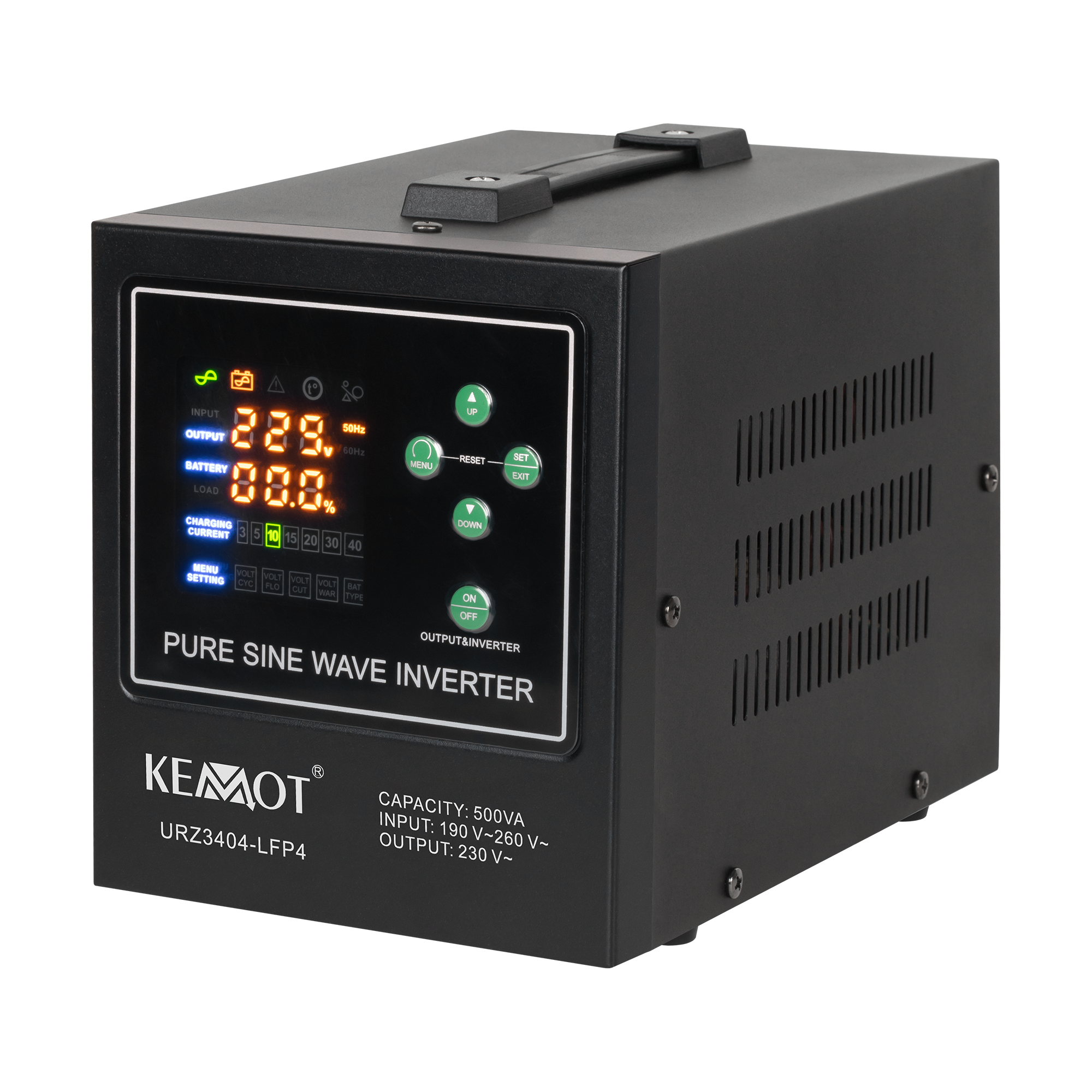 Awaryjne zasilacze KEMOT PROSinus wyposażone są w przejrzysty wyświetlacz LED, który wskaże aktualny status pracy urządzenia. Na wyświetlaczu skontrolujesz m.in. poziom napięcia wejściowego, wyjściowego i częstotliwości. Co więcej szybko sprawdzisz też poziom obciążenia i poziom naładowania baterii.