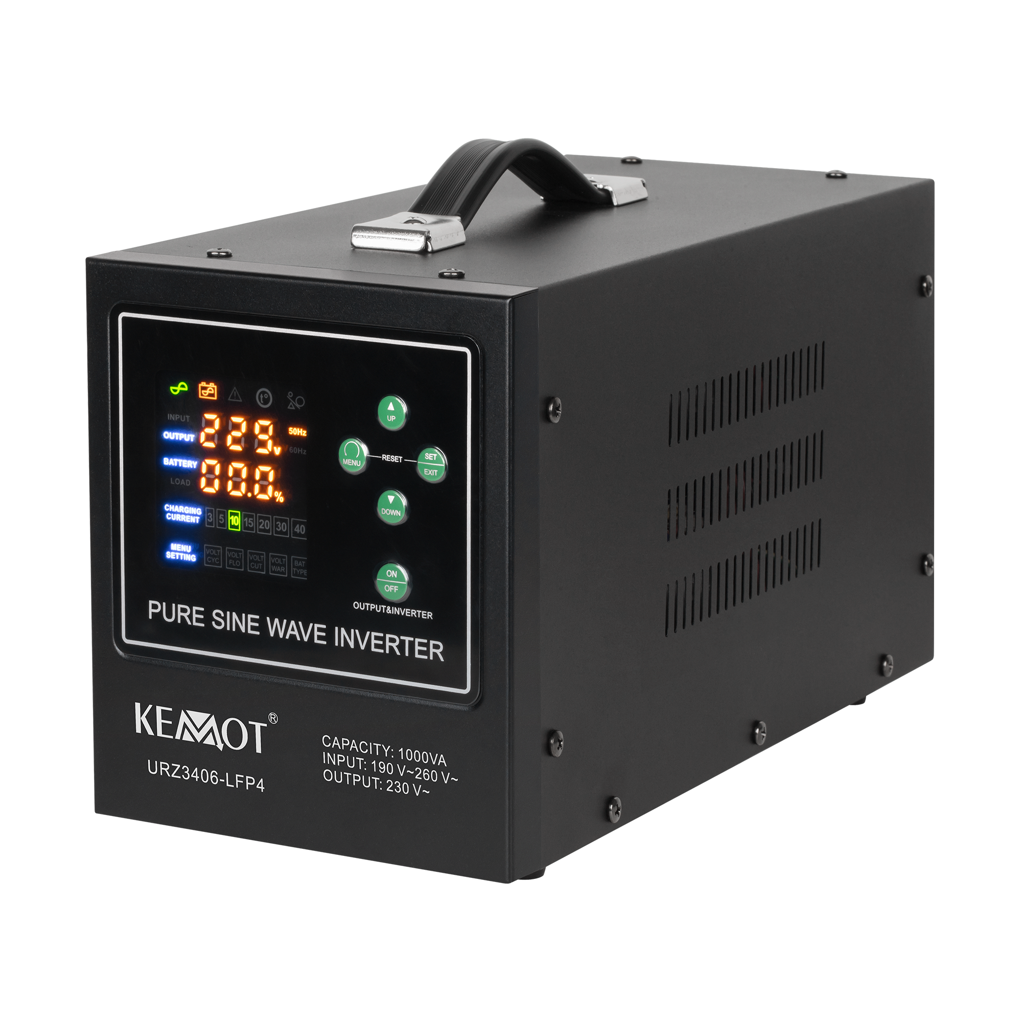 Awaryjne zasilacze KEMOT PROSinus wyposażone są w przejrzysty wyświetlacz LED, który wskaże aktualny status pracy urządzenia. Na wyświetlaczu skontrolujesz m.in. poziom napięcia wejściowego, wyjściowego i częstotliwości. Co więcej szybko sprawdzisz też poziom obciążenia i poziom naładowania baterii.