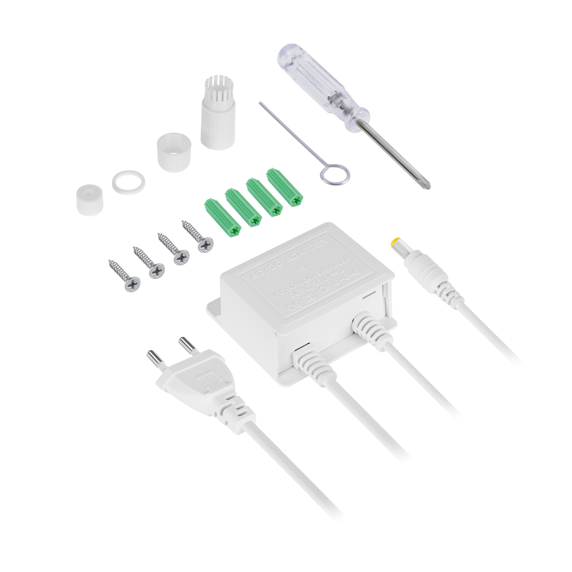 W zestawie: zasilacz sieciowy (1 m), kołki montażowe, śruby, klucz