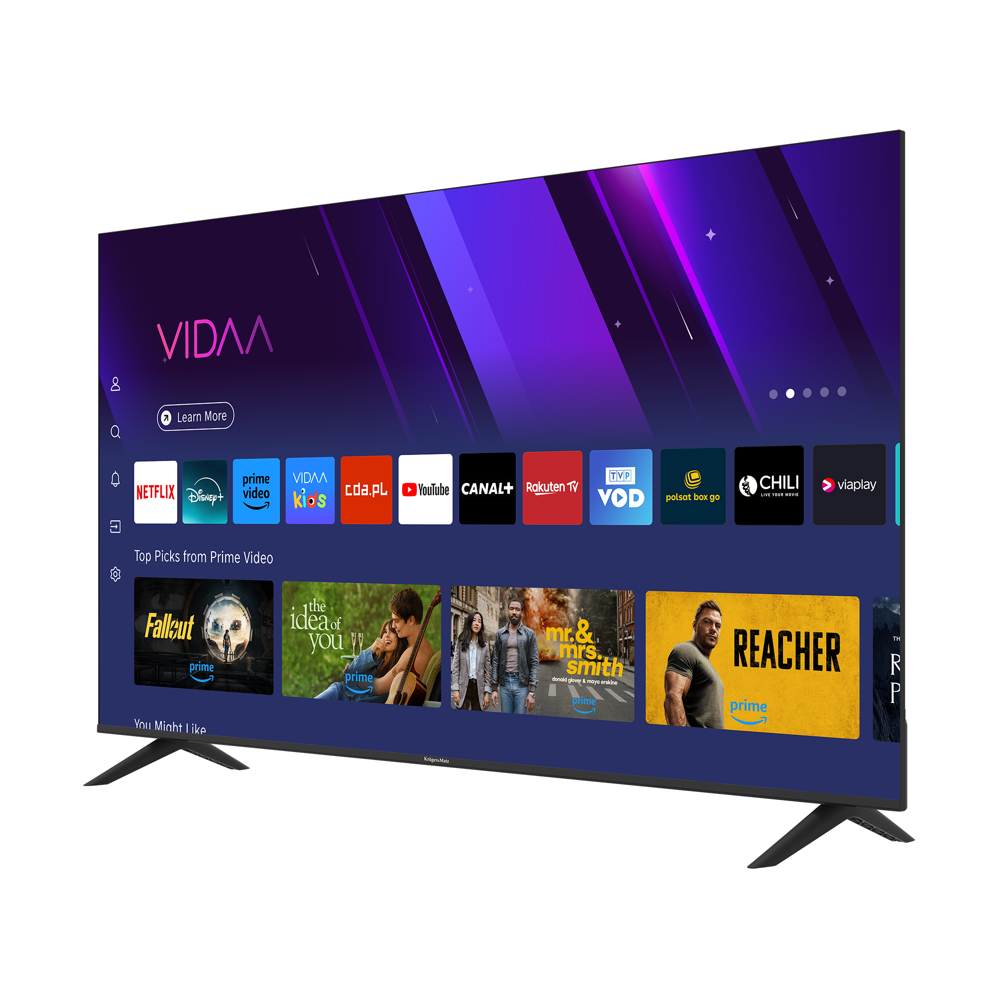 Telewizor Kruger&Matz KM0265UHD-V2, dzięki systemowi VIDAA oferuje dostęp do najlepszych treści muzycznych, filmowych i sportowych, w tym popularnych platform takich jak: Netflix, YouTube, Disney Plus czy Amazon Prime Video. Ciesz się ulubionymi filmami i serialami w wysokiej jakości kiedy tylko chcesz.