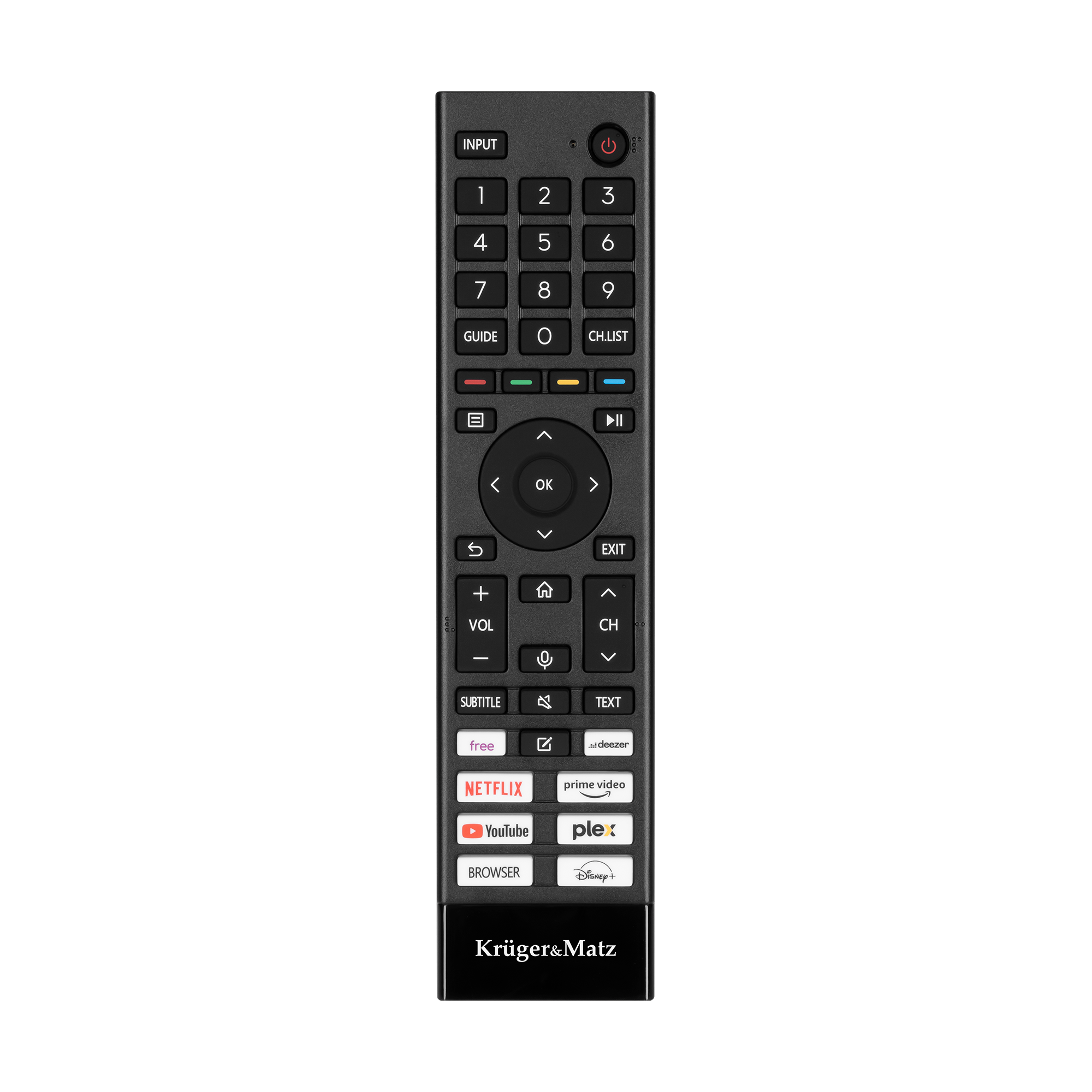Dołączony do telewizora Kruger&Matz pilot został zaprojektowany z myślą o wygodnym i intuicyjnym użytkowaniu. Na pilocie znajdują się skróty do najpopularniejszych aplikacji, takich jak Netflix, YouTube czy Amazon Prime Video. Dzięki nim możesz szybko uruchomić ulubione treści bez konieczności przeglądania menu czy wyszukiwania aplikacji.