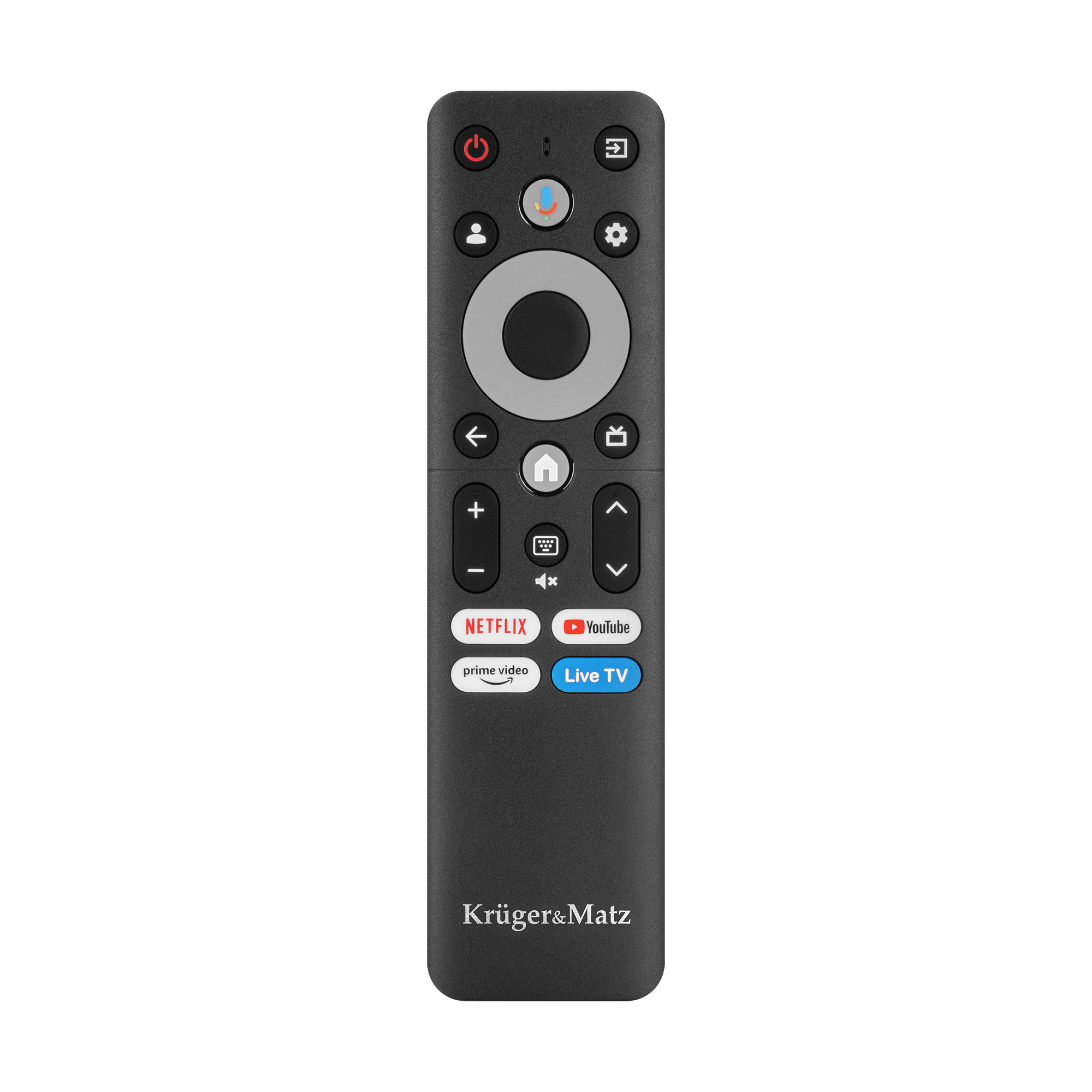 Dołączony do telewizora Kruger&Matz pilot został zaprojektowany z myślą o wygodnym i intuicyjnym użytkowaniu. Na pilocie znajdują się skróty do najpopularniejszych aplikacji, takich jak Netflix, YouTube czy Amazon Prime Video. Dzięki nim możesz szybko uruchomić ulubione treści bez konieczności przeglądania menu czy wyszukiwania aplikacji.