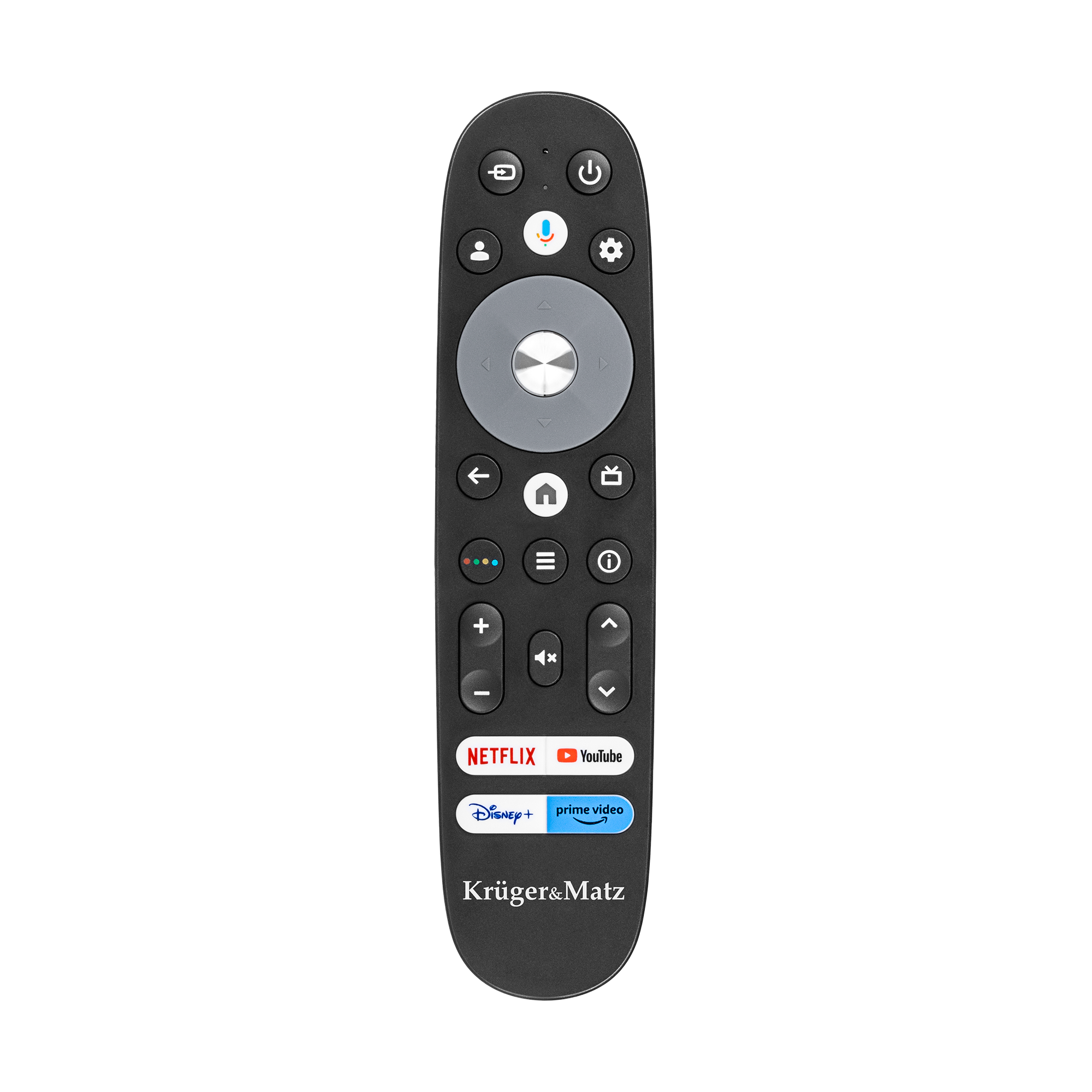 Pilot został zaprojektowany z myślą o telewizorach Kruger&Matz z systemem Google TV, dzięki czemu działa płynnie i bezproblemowo. Jego intuicyjne rozmieszczenie przycisków sprawia, że obsługa jest niezwykle prosta. Z kolei ergonomiczny design i szybka reakcja na polecenia gwarantują komfort użytkowania na najwyższym poziomie.