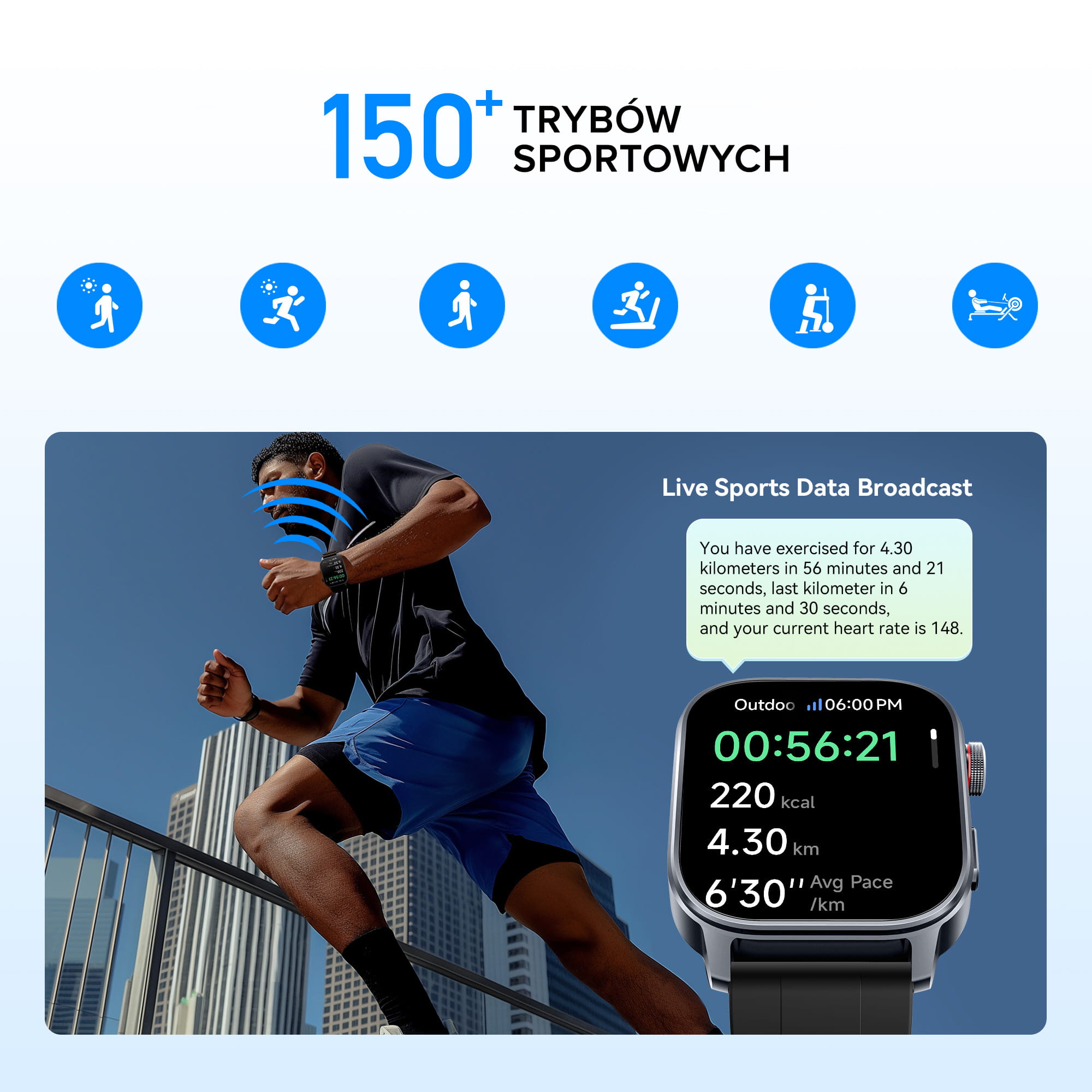 Funkcje: Monitor snu, krokomierz, licznik spalonych kalorii, śledzenie cyklu menstruacyjnego, pomiar natlenienia krwi, zarządzanie połączeniami, zarządzanie muzyką, powiadomienia z telefonu, budzik, alert bezczynności, stoper, minutnik, pogoda