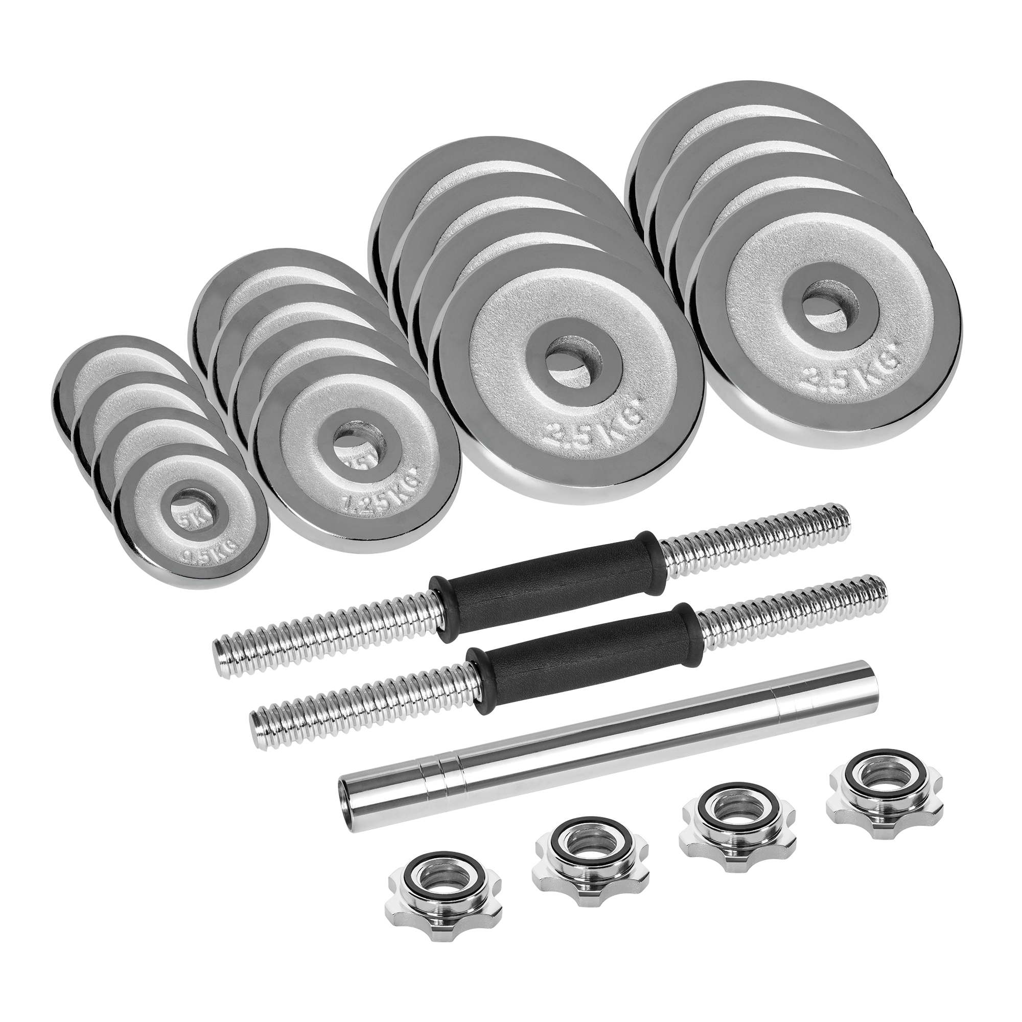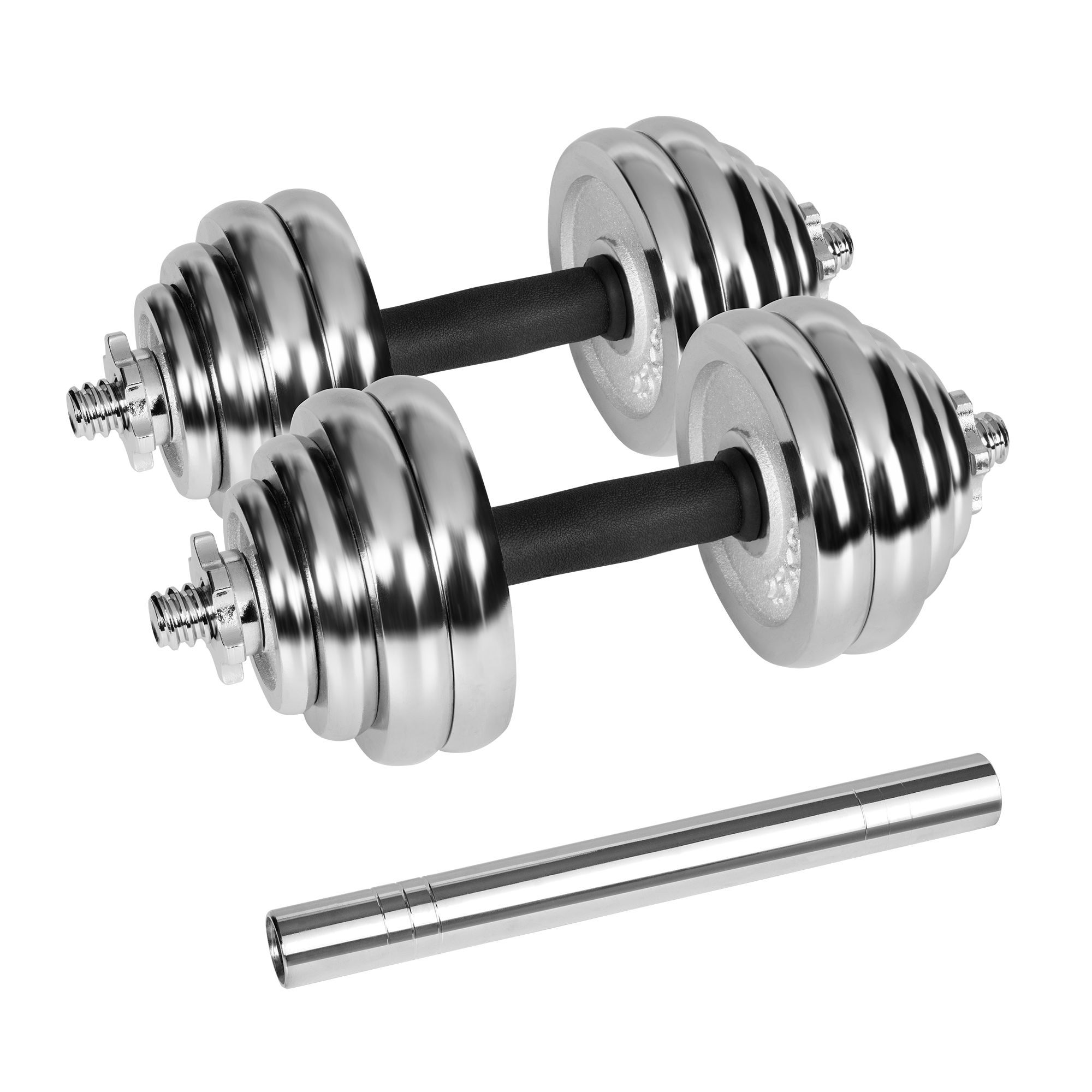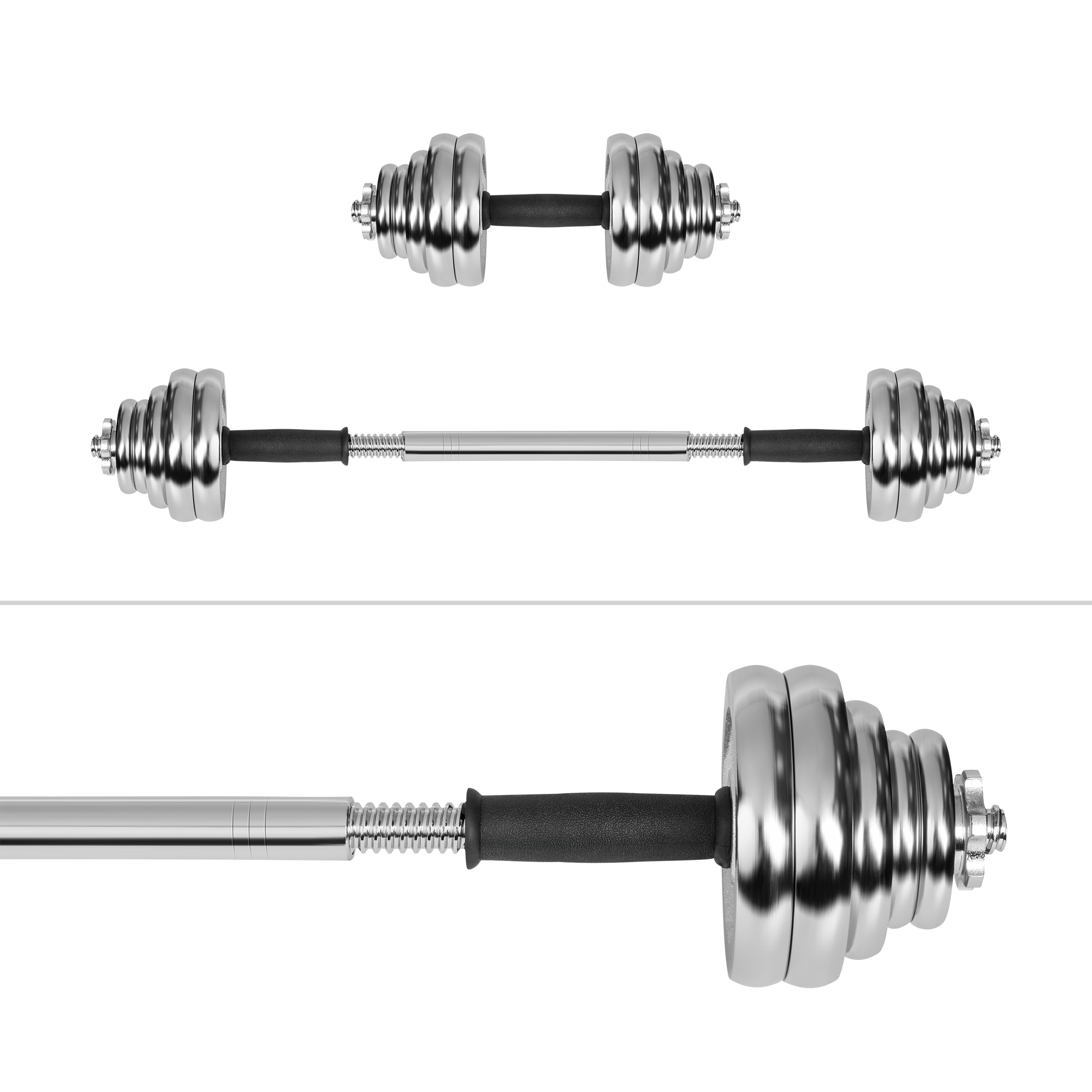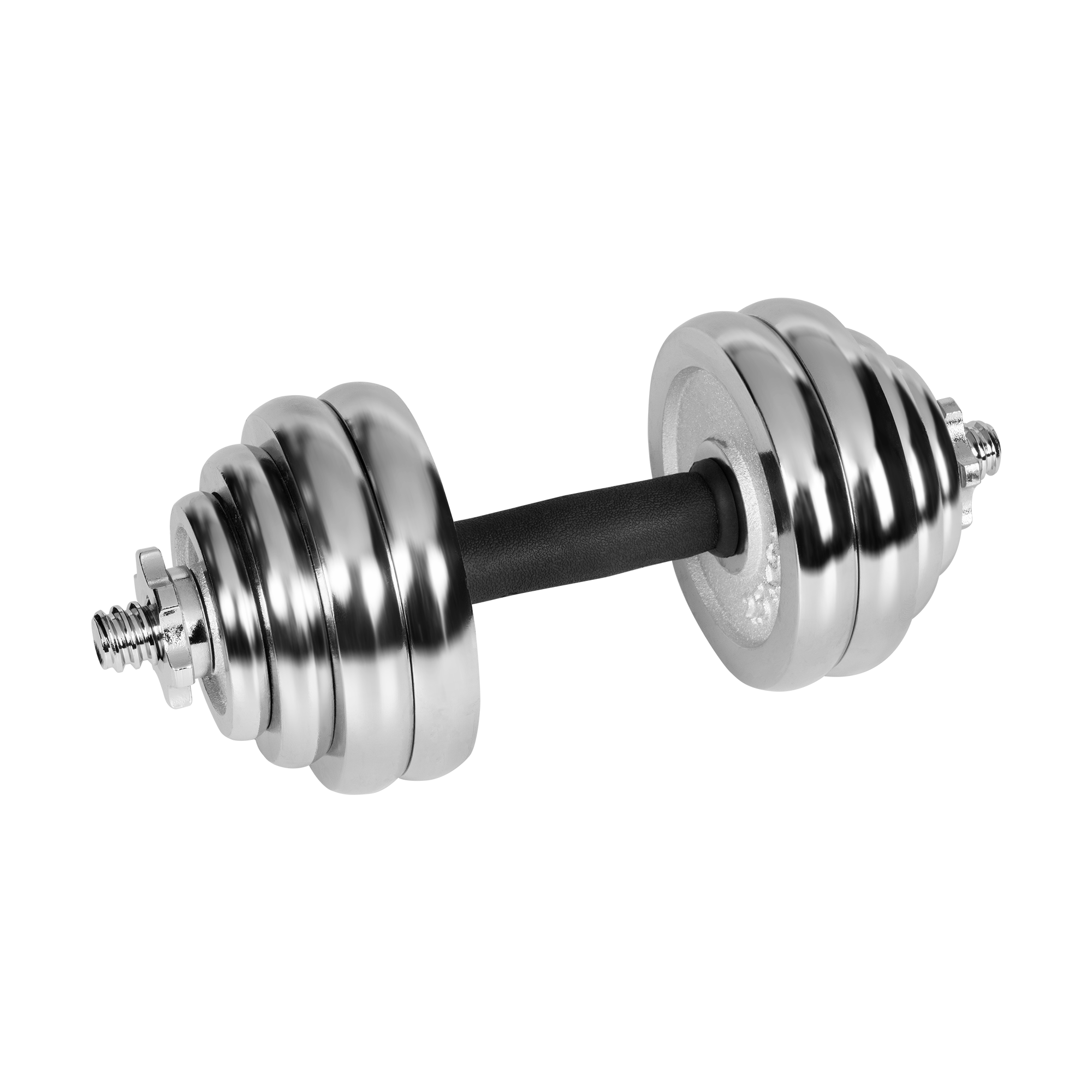 Zestaw wykonany z wysokiej jakości żeliwa, pokrytego trwałą powłoką chromowaną, która zabezpiecza przed korozją, zarysowaniami i uszkodzeniami mechanicznymi. Chrom nadaje hantlom elegancki wygląd i zwiększa ich żywotność, nawet przy intensywnym użytkowaniu.