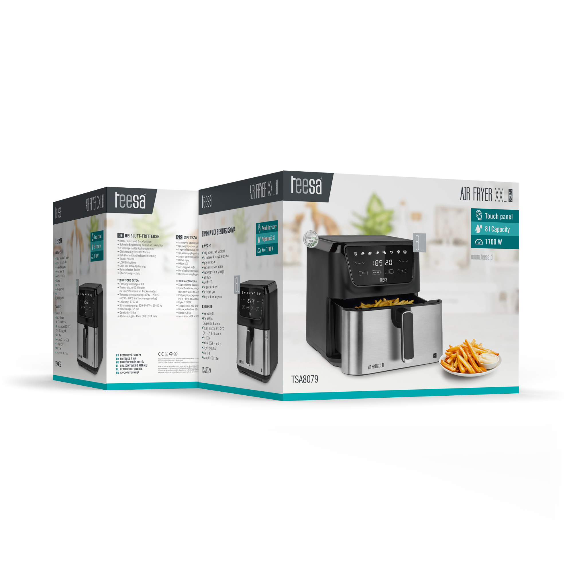 Frytkownica beztłuszczowa Teesa wyposażona jest w intuicyjny panel dotykowy oraz czytelny ekran LCD, dzięki czemu korzystanie z niej jest niezwykle łatwe. Kilka dotknięć wystarczy, aby ustawić odpowiednią temperaturę i czas pieczenia lub wybrać gotowy program. Dodatkowo nowoczesny design doskonale komponuje się z każdym wnętrzem — zarówno klasycznym, jak i nowoczesnym.