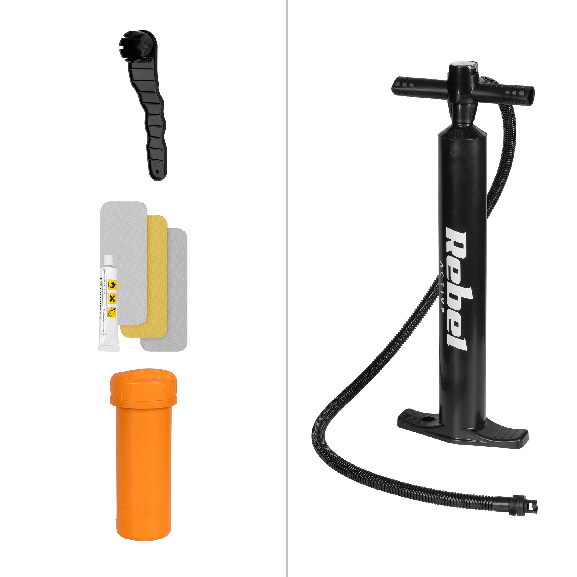 W zestawie: pompka ręczna, plecak transportowy, zestaw naprawczy (klucz do zaworu, łatki naprawcze, klej)