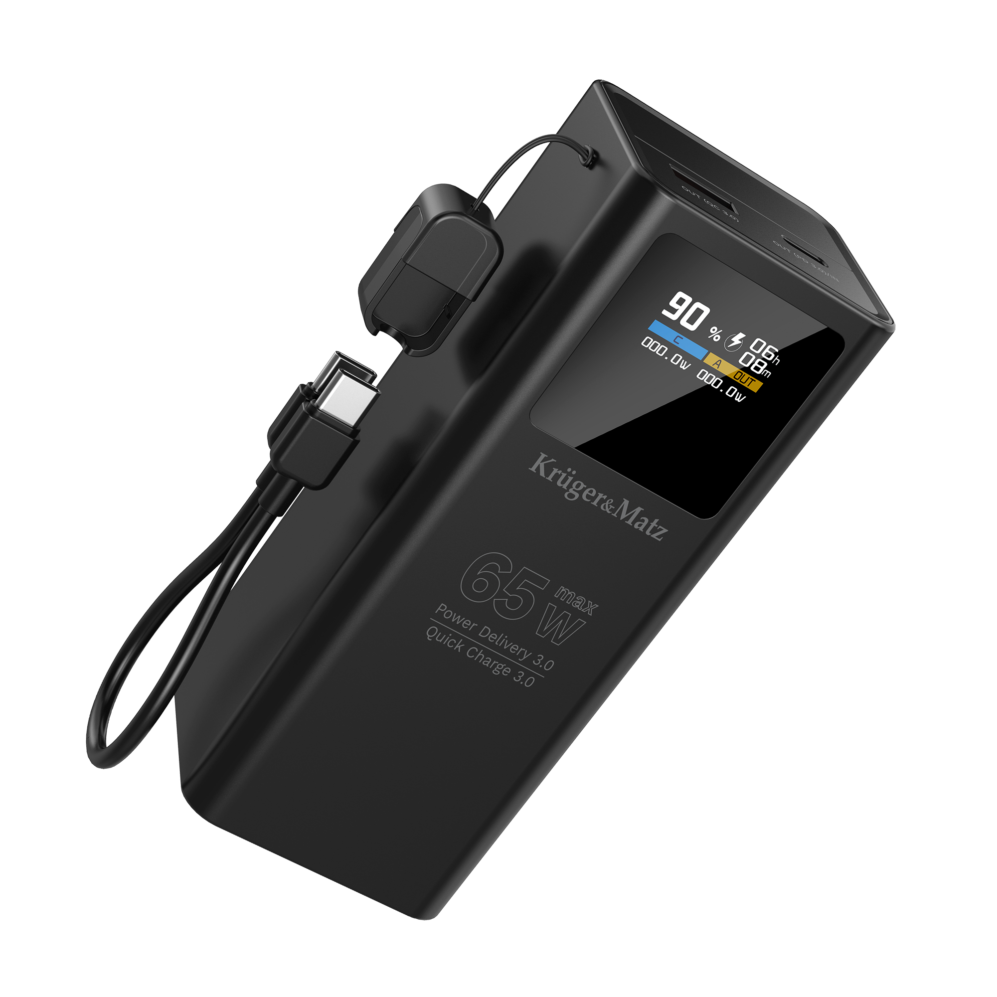 Power bank Kruger&Matz KM0915 o pojemności 20 000 mAh to pewność, że nie zabraknie Ci energii w podróży, pracy czy na uczelni. Z łatwością naładujesz nim kilka razy smartfon, uzupełnisz baterię w tablecie, a nawet w laptopie. Wbudowany wyświetlacz LCD informuje o poziomie energii, napięciu oraz czasie ładowania, dzięki czemu zawsze wiesz, ile mocy masz do dyspozycji.