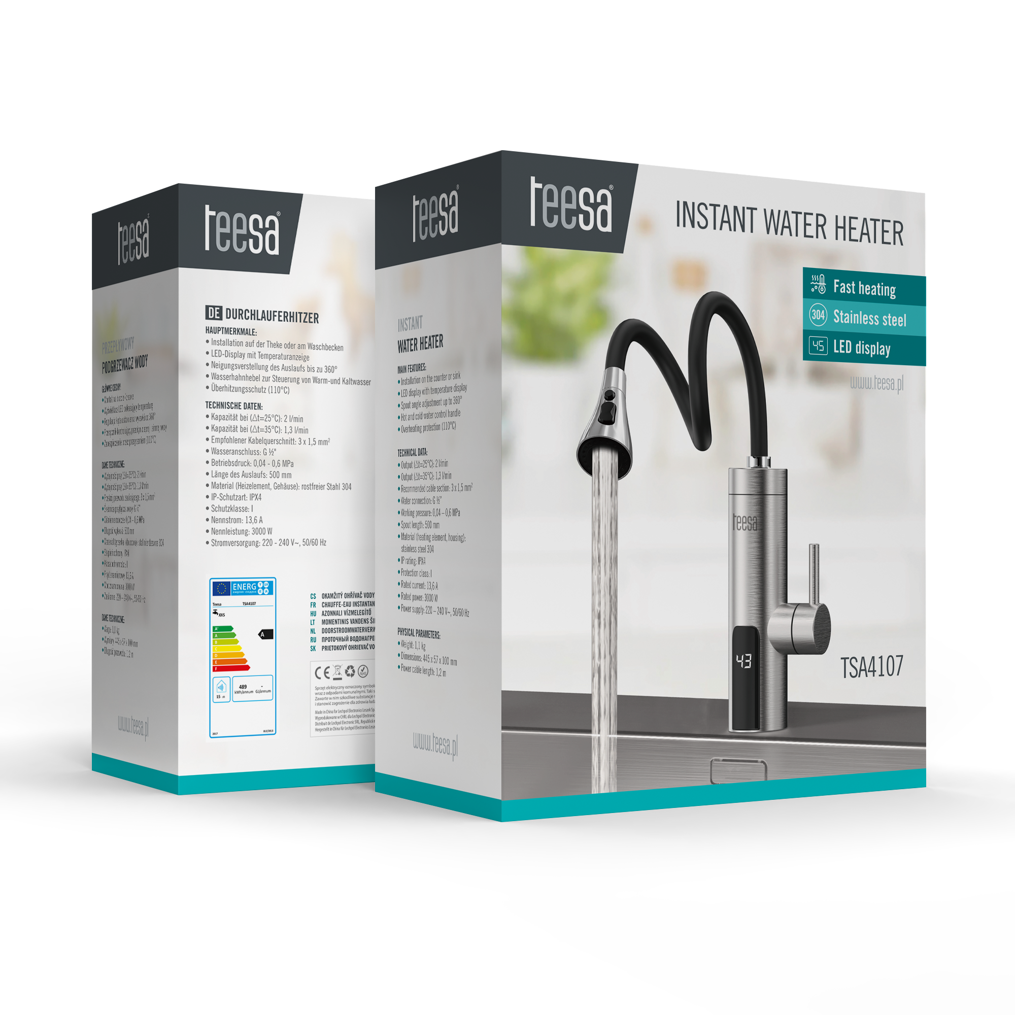 Przepływowy podgrzewacz wody Teesa to praktyczne rozwiązanie tam, gdzie liczy się mobilność, oszczędność i natychmiastowy dostęp do ciepłej wody. Idealny do kuchni, garaży, domków letniskowych i warsztatów. Zapewnia komfortowe użytkowanie bez bojlera i bez czekania, a kompaktowa konstrukcja umożliwia montaż niemal w dowolnym miejscu.