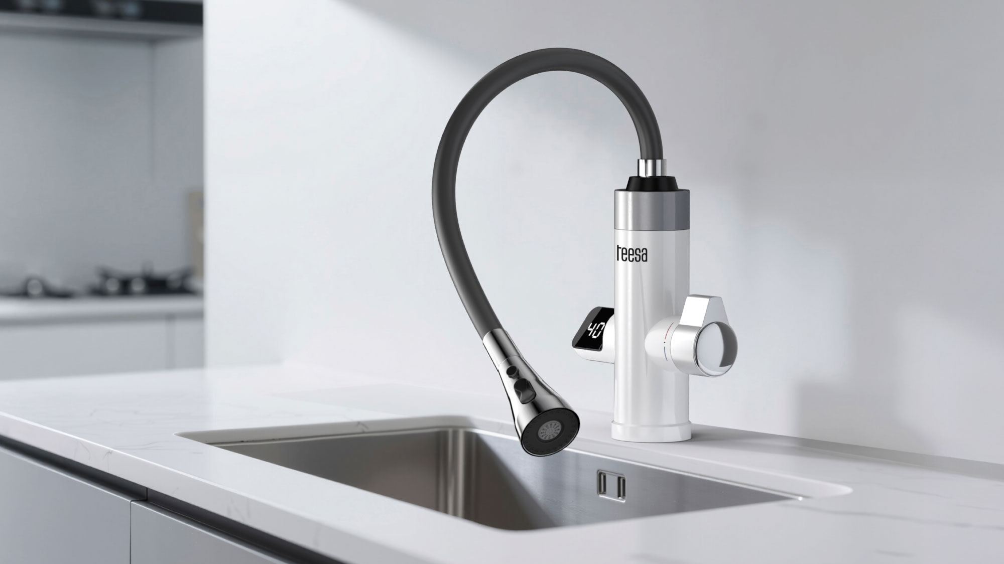 Instalacja urządzenia nie wymaga skomplikowanych przeróbek instalacji wodnej — wystarczy standardowe przyłącze G1/2”. Podgrzewacz montuje się bezpośrednio na blacie lub zlewie, a przewód zasilający 1,2 m zapewnia swobodę ustawienia. To idealne rozwiązanie do miejsc bez ciepłej wody — szybkie, bezpieczne i gotowe do pracy w kilka chwil od montażu.
