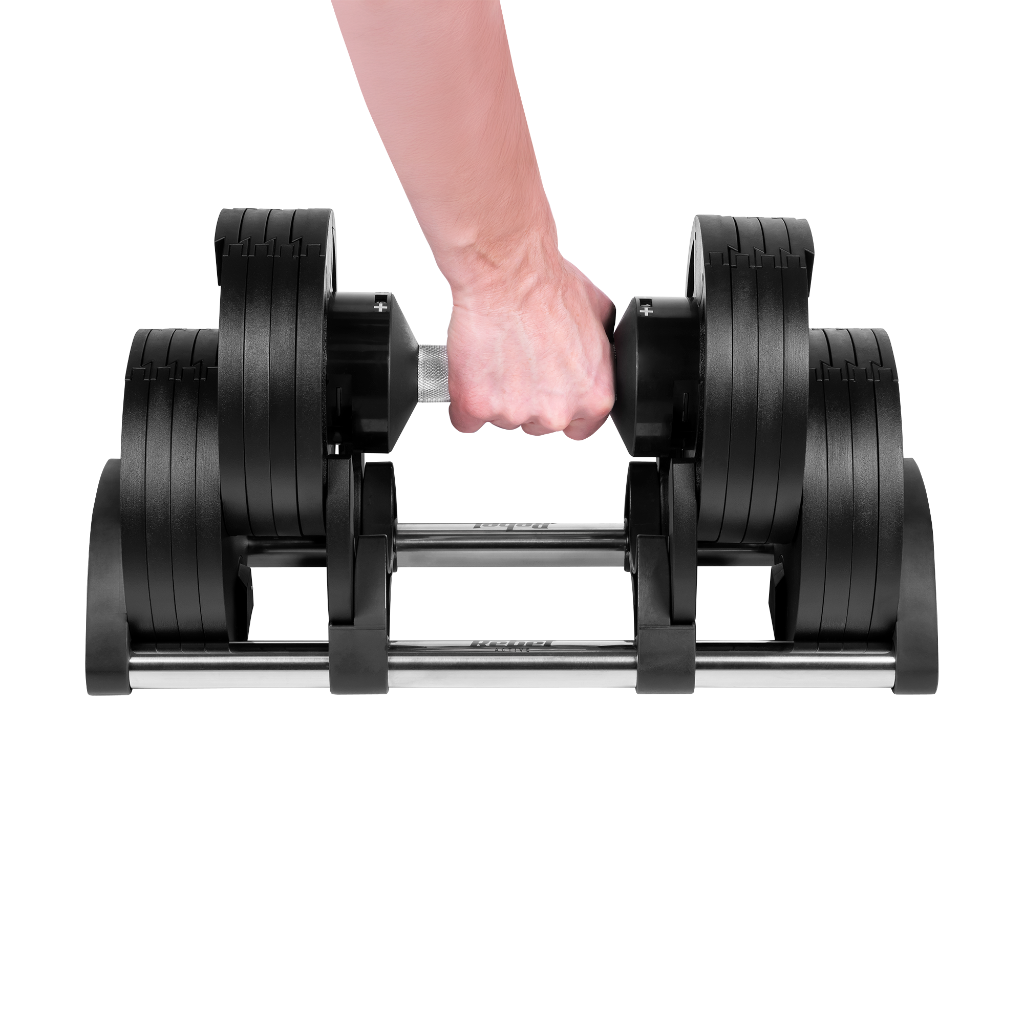 System automatycznej regulacji pozwala na szybką zmianę ciężaru w 12 konfiguracjach – od 2 do 36 kg – poprzez prosty obrót uchwytu. Dzięki temu hantle regulowane Rebel Active zastępują cały zestaw klasycznych obciążeń, oszczędzając miejsce w domu i czasie treningu. Precyzyjny mechanizm blokuje wybrany ciężar, gwarantując płynność i bezpieczeństwo każdej sesji ćwiczeń.