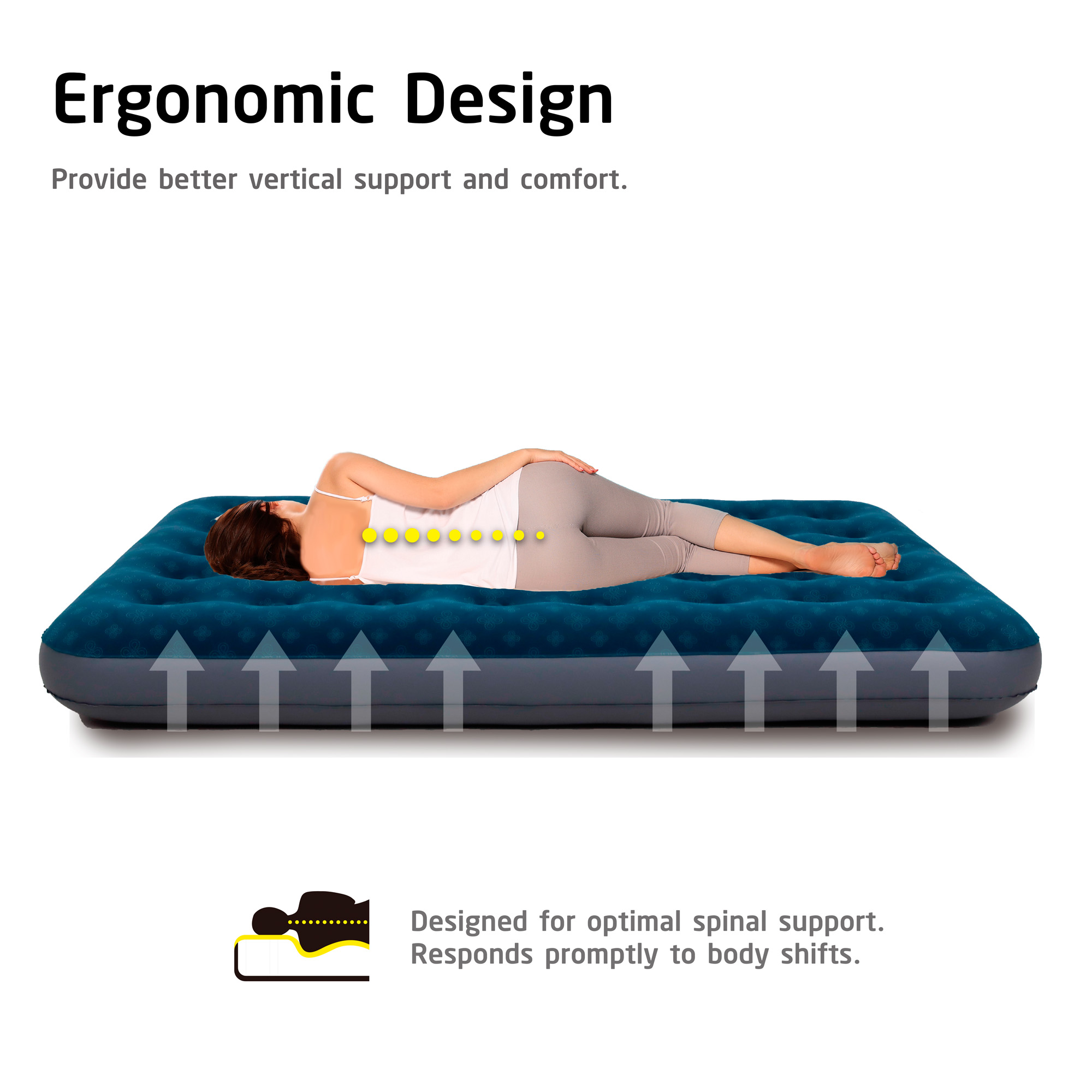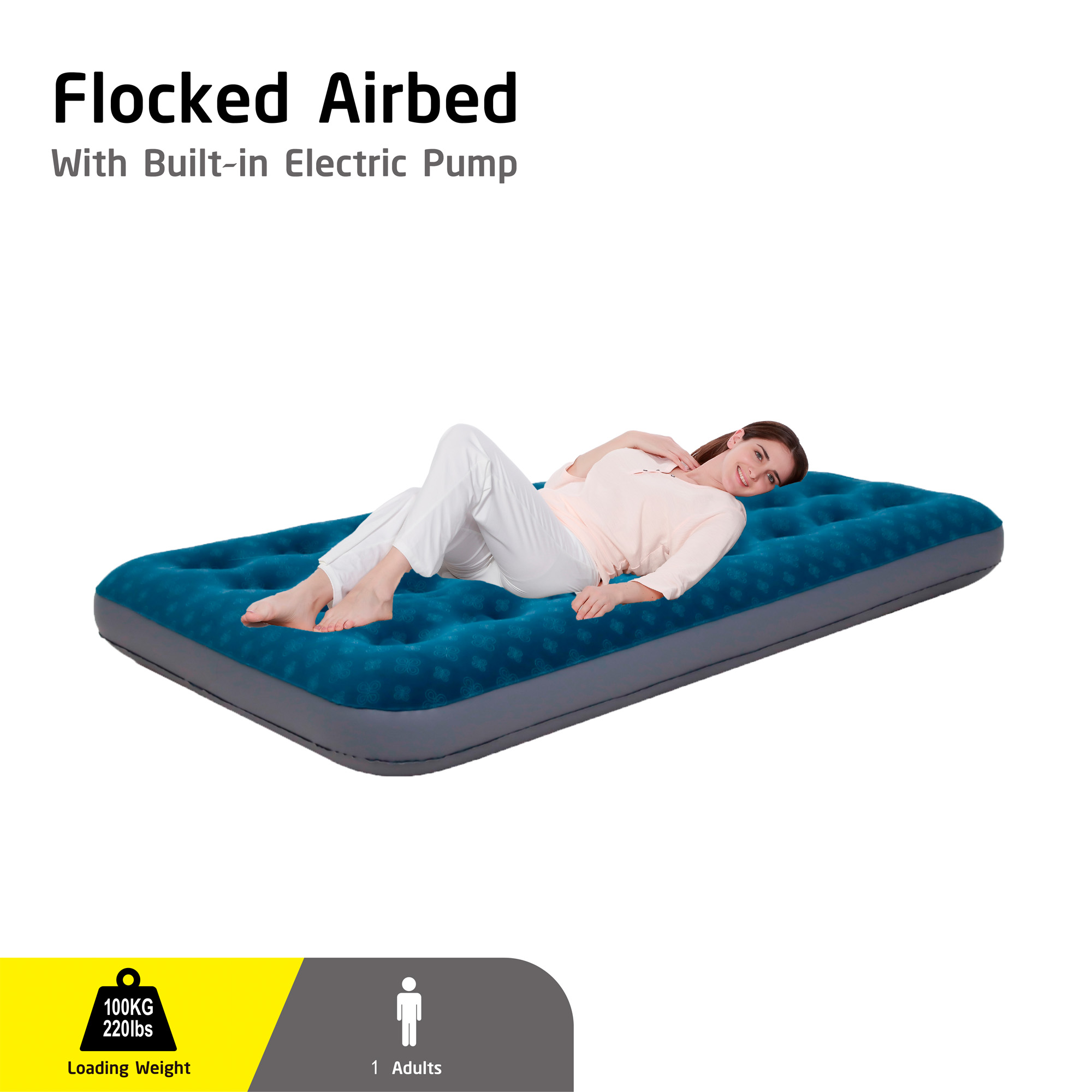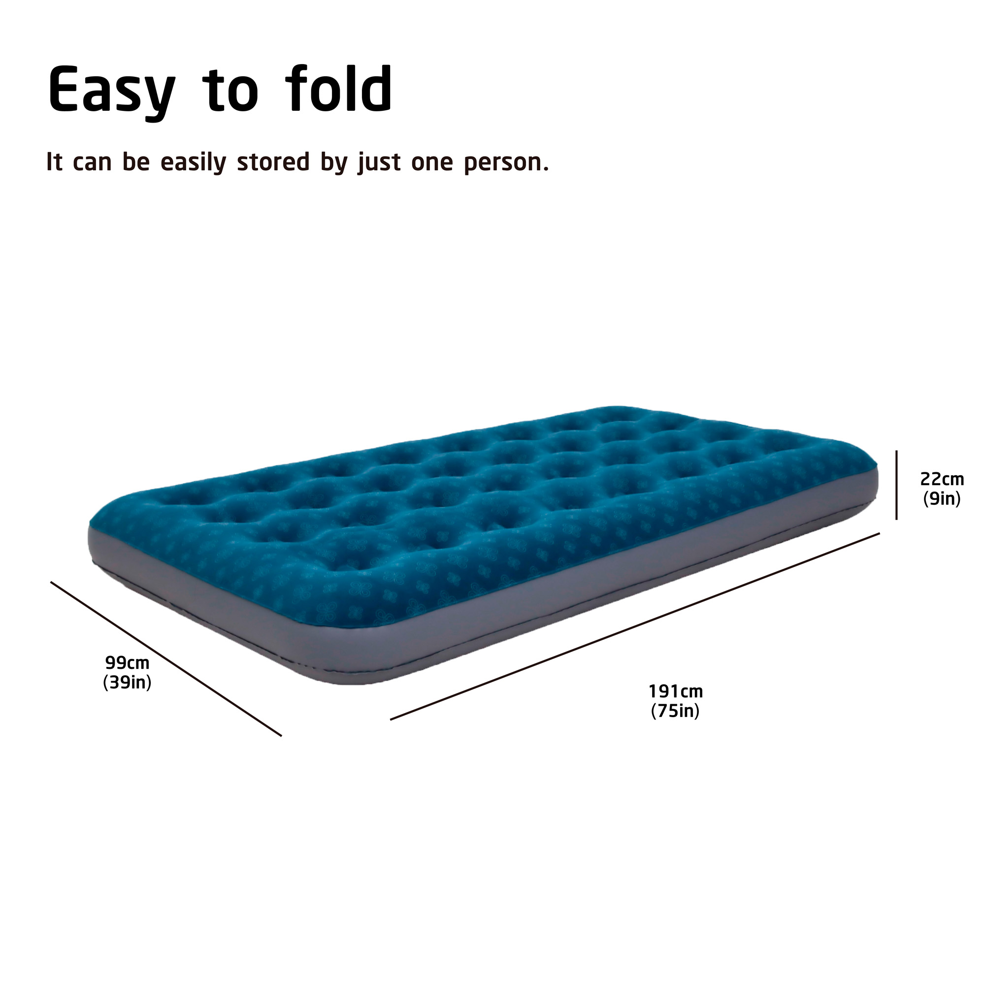 Dzięki wysokości 22 cm i długości 191 cm materac zapewnia stabilne podparcie oraz izolację od podłoża. Powierzchnia pokryta miękkim welurem jest przyjemna w dotyku i zapobiega przesuwaniu się pościeli lub śpiwora.