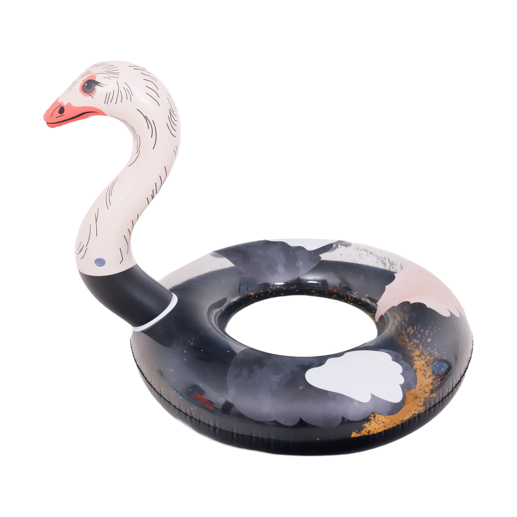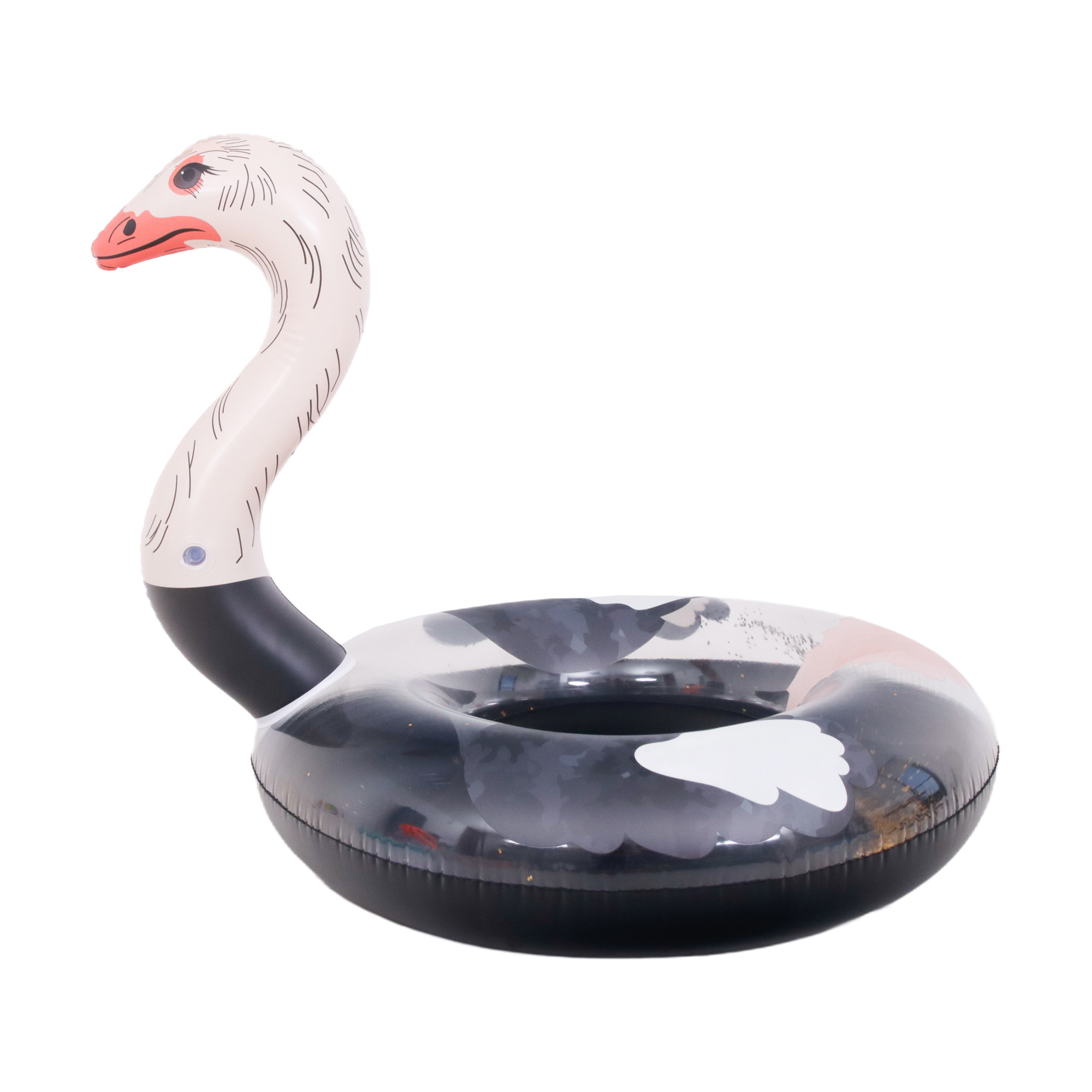 Kółko SUNCLUB przybiera kształt rozbawionego strusia z długą szyją, dużymi oczami i kolorowym dziobem. Ten nietypowy design wyróżnia się na tle innych akcesoriów basenowych, wywołując uśmiech i przyciągając spojrzenia. To świetny gadżet na plażę, imprezę przy basenie albo do zabawy z przyjaciółmi.