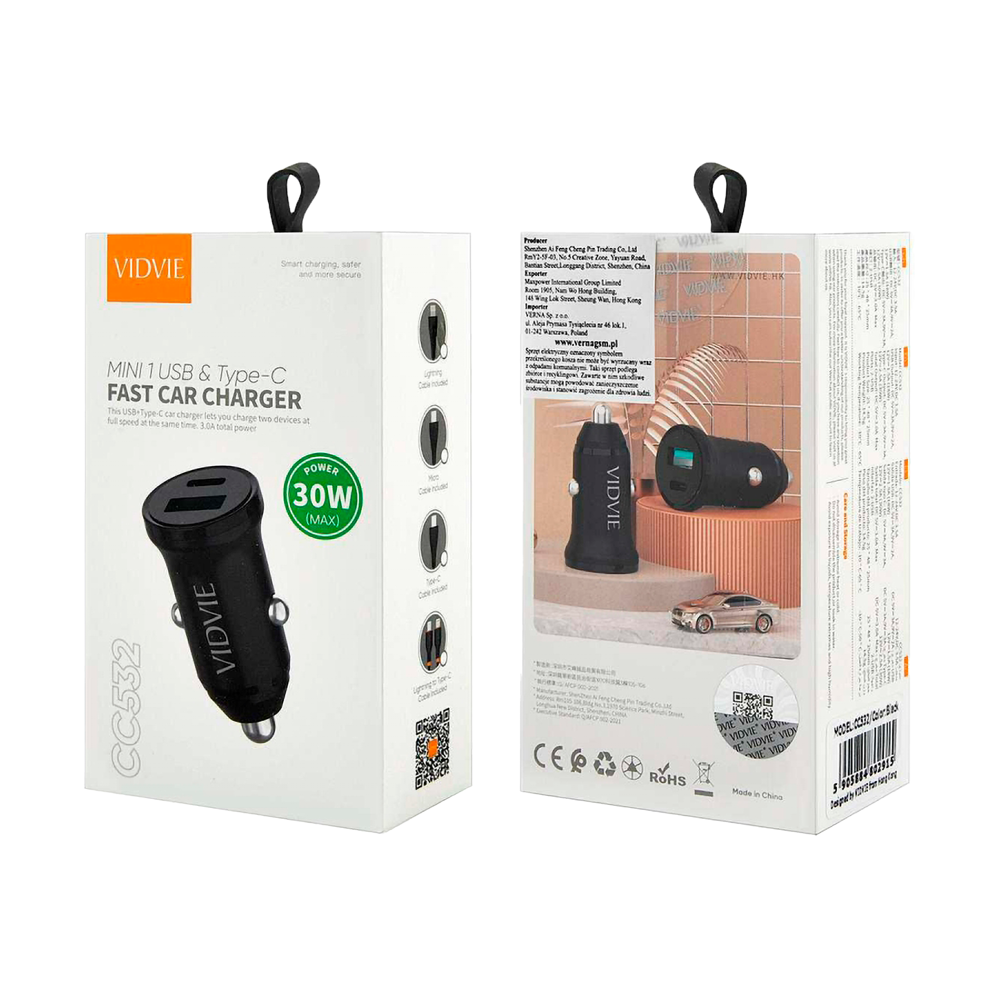 Ładowarka samochodowa 30 W USB + USB typu C z funkcją PowerDelivery i QuickCharge