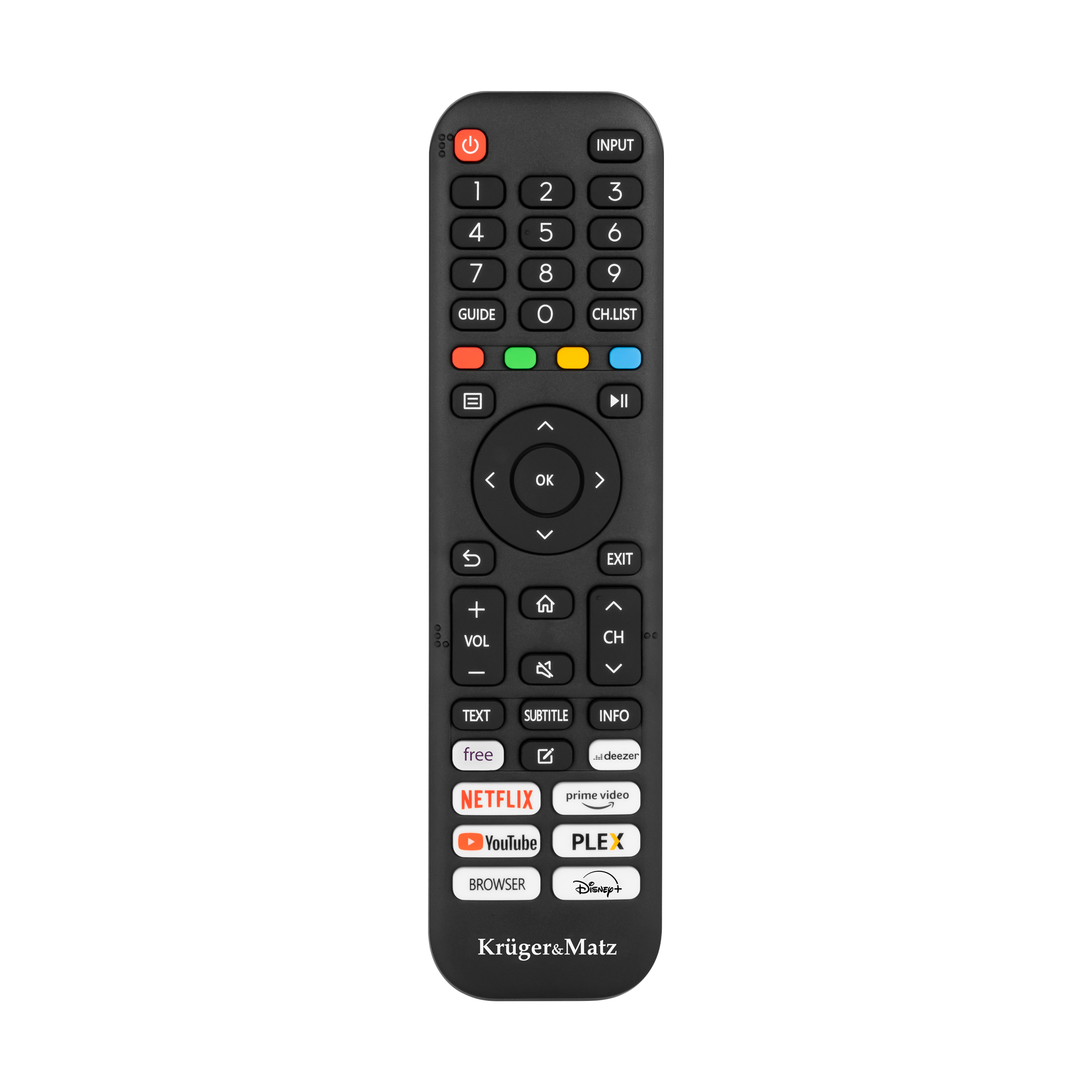 Dołączony do telewizora Kruger&Matz pilot został zaprojektowany z myślą o wygodnym i intuicyjnym użytkowaniu. Na pilocie znajdują się skróty do najpopularniejszych aplikacji, takich jak Netflix, YouTube czy Amazon Prime Video. Dzięki nim możesz szybko uruchomić ulubione treści bez konieczności przeglądania menu czy wyszukiwania aplikacji.